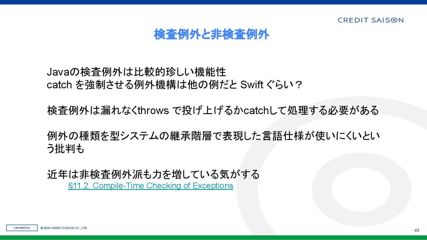 43. 43 © 2024 CREDIT SAISON CO., LTD. CONFIDENTIAL 検査例外と非検査例外 Javaの検査例外は比較的珍しい機能性