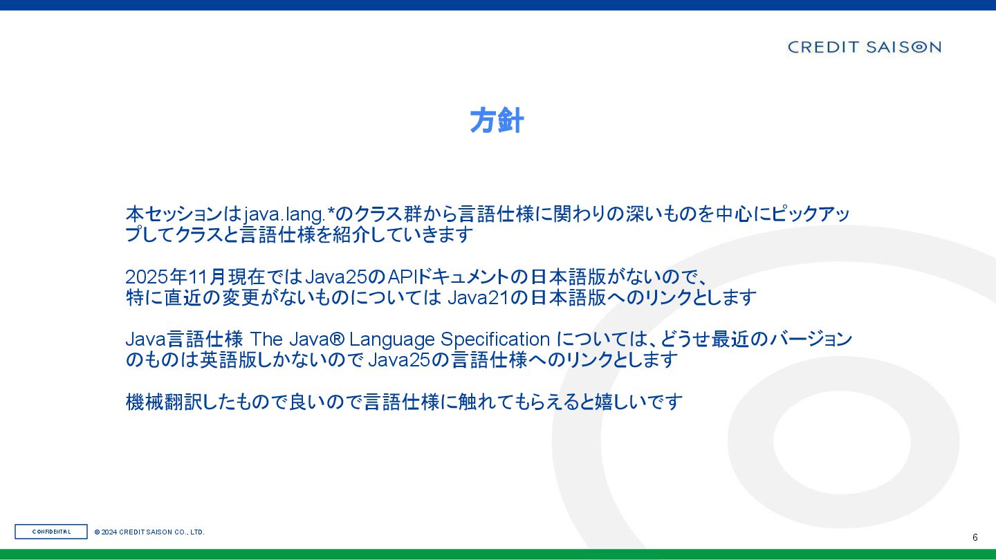 6. 6 © 2024 CREDIT SAISON CO., LTD. CONFIDENTIAL 方針 本セッションはjava.lang.*のクラス群から言語仕様に関わりの深いものを中心にピックアッ
