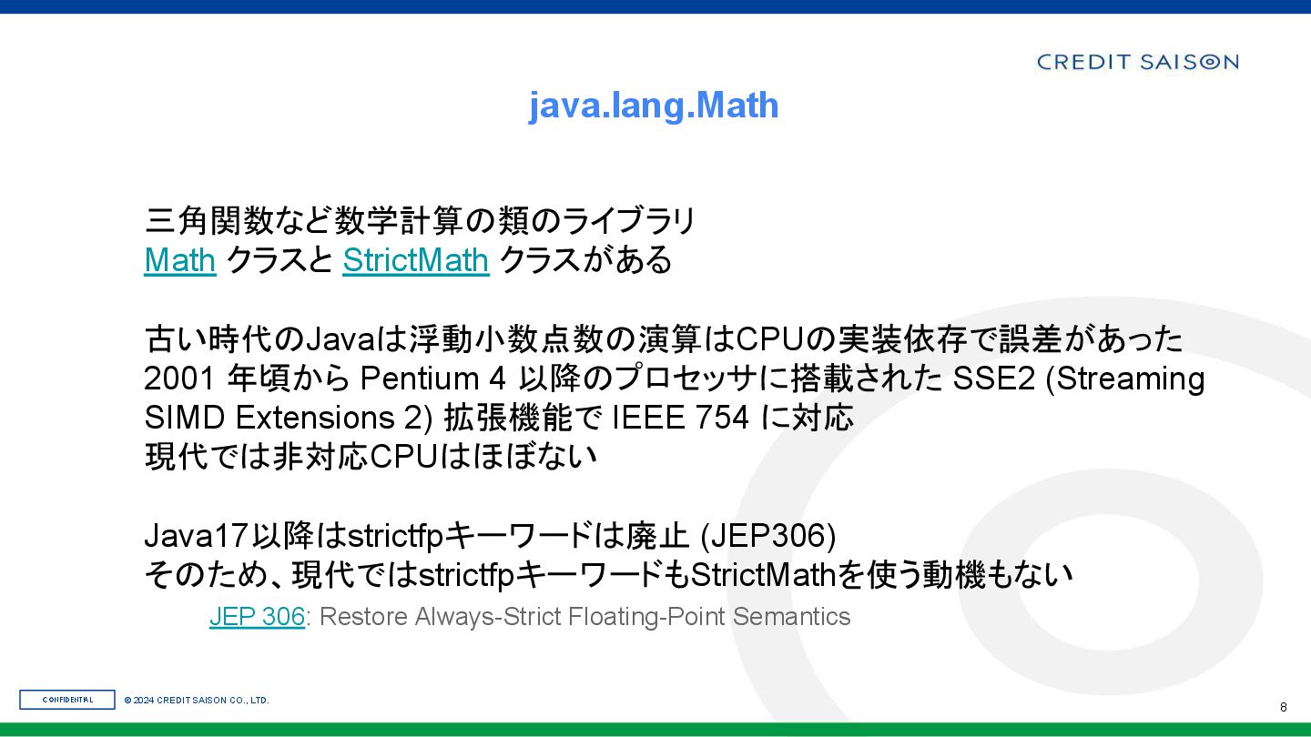 8. 8 © 2024 CREDIT SAISON CO., LTD. CONFIDENTIAL java.lang.Math 三角関数など数学計算の類のライブラリ