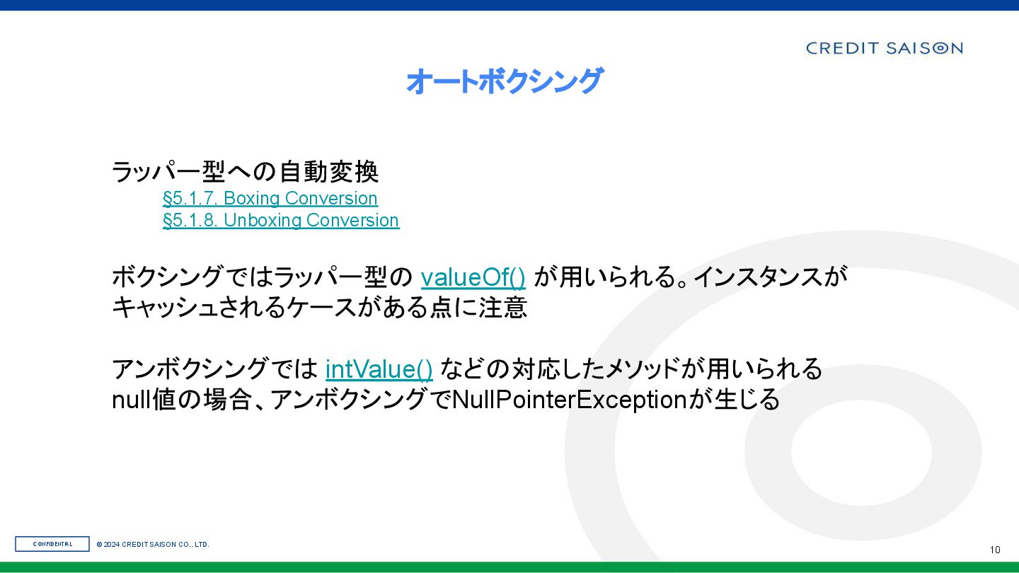 §5.1.7. Boxing Conversion §5.1.8. Unboxing Conversion ボクシングではラッパー型の valueOf() が用いられる。インスタンスが キャッシュされるケースがある点に注意 アンボクシングでは intValue() などの対応したメソッドが用いられる null値の場合、アンボクシングでNullPointerExceptionが生じる