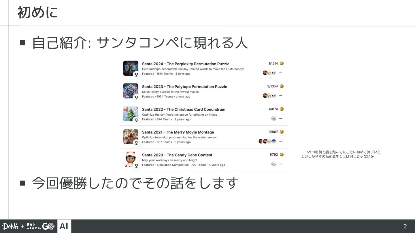 AI 2 ▪ 自己紹介: サンタコンペに現れる人 ▪ 今回優勝したのでその話をします 初めに コンペの名前で韻を踏んでたことに初めて気づいた というか今年の名前去年とほぼ同じじゃないか