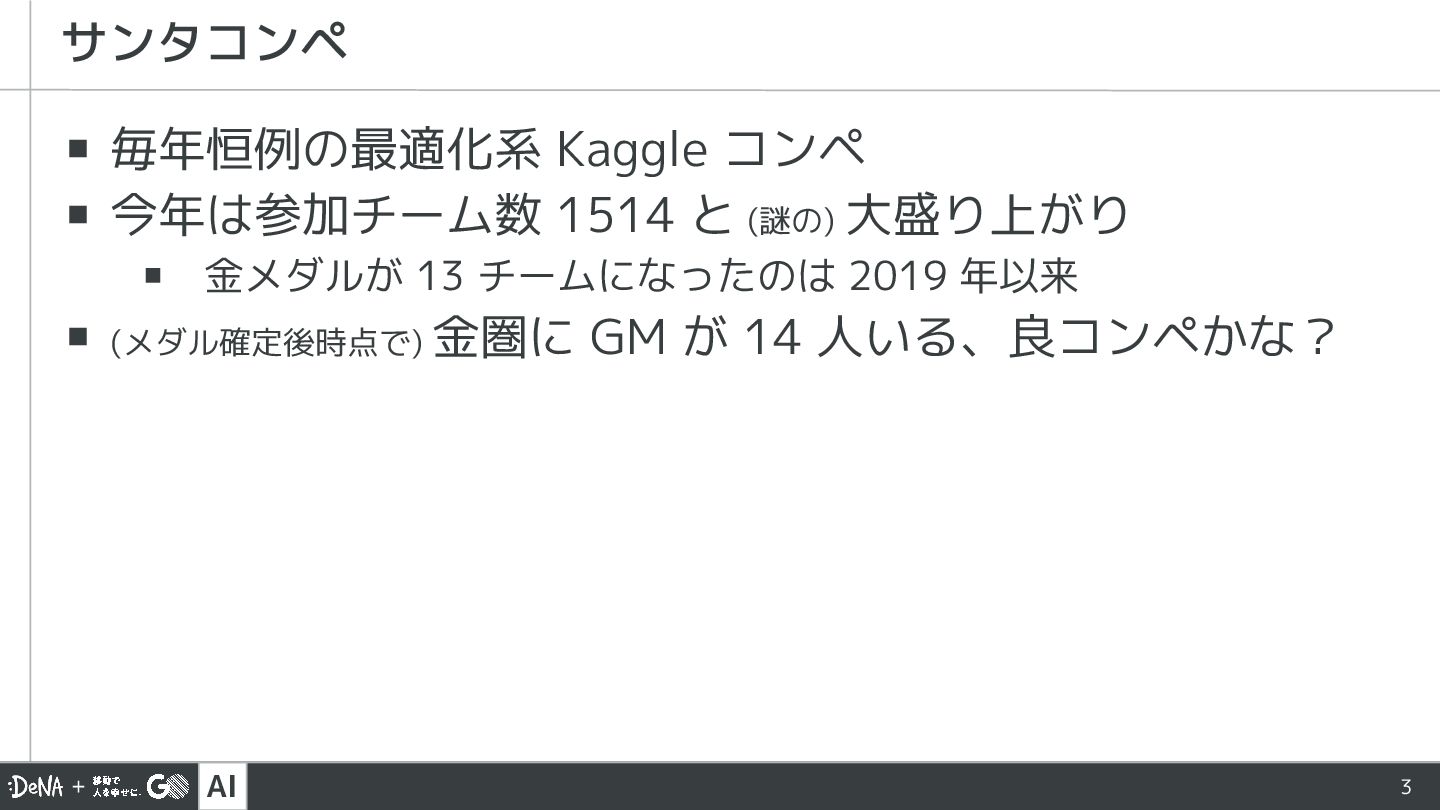 AI 3 ▪ 毎年恒例の最適化系 Kaggle コンペ ▪ 今年は参加チーム数 1514 と