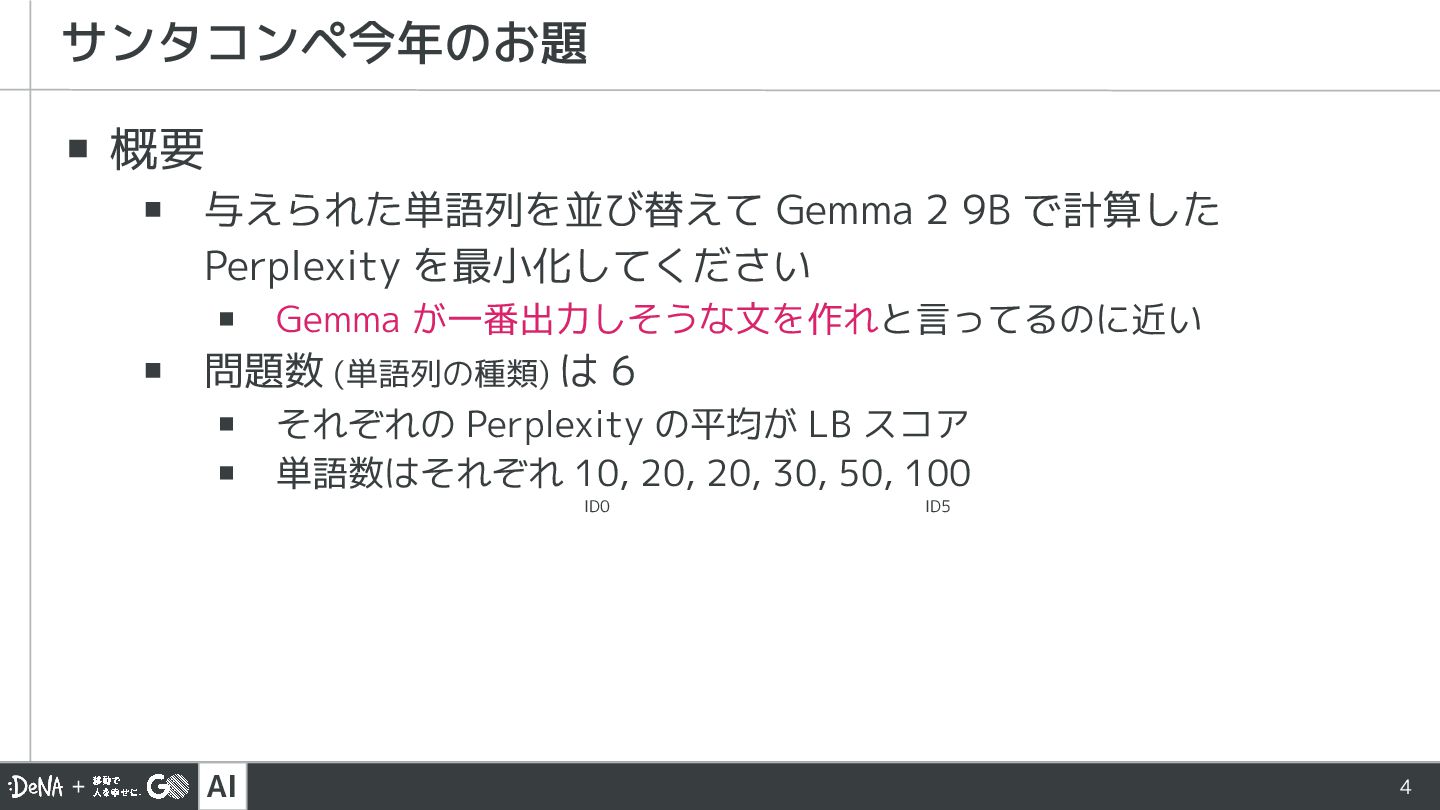 Perplexity を最小化してください ▪ Gemma が一番出力しそうな文を作れと言ってるのに近い ▪ 問題数 (単語列の種類) は 6 ▪ それぞれの Perplexity の平均が LB スコア ▪ 単語数はそれぞれ 10, 20, 20, 30, 50, 100 サンタコンペ今年のお題 ID0 ID5