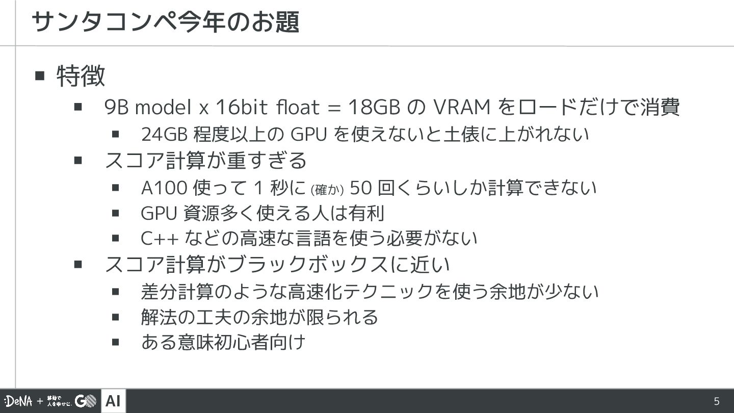 = 18GB の VRAM をロードだけで消費 ▪ 24GB 程度以上の GPU を使えないと土俵に上がれない ▪ スコア計算が重すぎる ▪ A100 使って 1 秒に (確か) 50 回くらいしか計算できない ▪ GPU 資源多く使える人は有利 ▪ C++ などの高速な言語を使う必要がない ▪ スコア計算がブラックボックスに近い ▪ 差分計算のような高速化テクニックを使う余地が少ない ▪ 解法の工夫の余地が限られる ▪ ある意味初心者向け サンタコンペ今年のお題