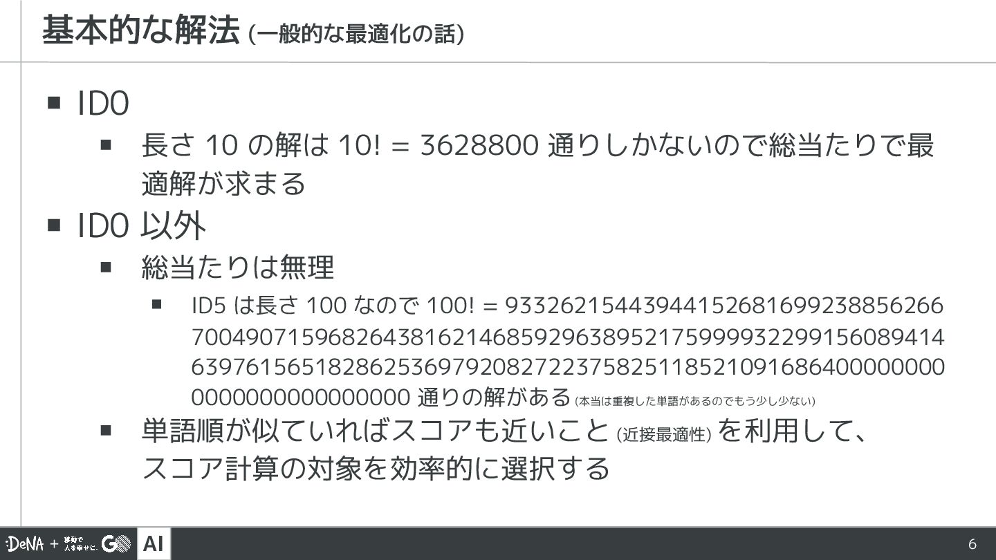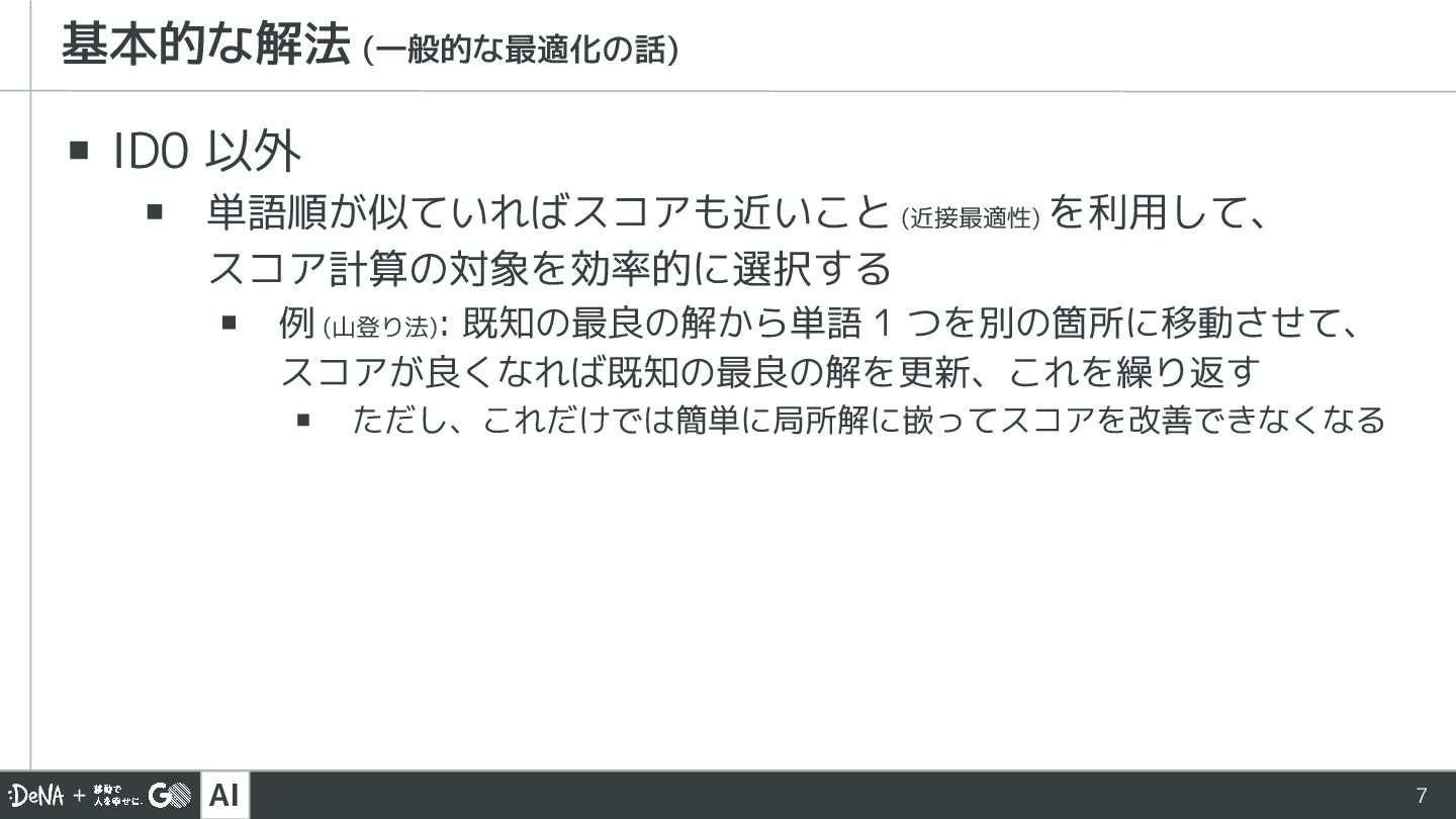 3628800 通りしかないので総当たりで最 適解が求まる ▪ ID0 以外 ▪ 総当たりは無理 ▪ ID5 は長さ 100 なので 100! = 93326215443944152681699238856266 7004907159682643816214685929638952175999932299156089414 6397615651828625369792082722375825118521091686400000000 0000000000000000 通りの解がある (本当は重複した単語があるのでもう少し少ない) ▪ 単語順が似ていればスコアも近いこと (近接最適性) を利用して、 スコア計算の対象を効率的に選択する 基本的な解法 (一般的な最適化の話)