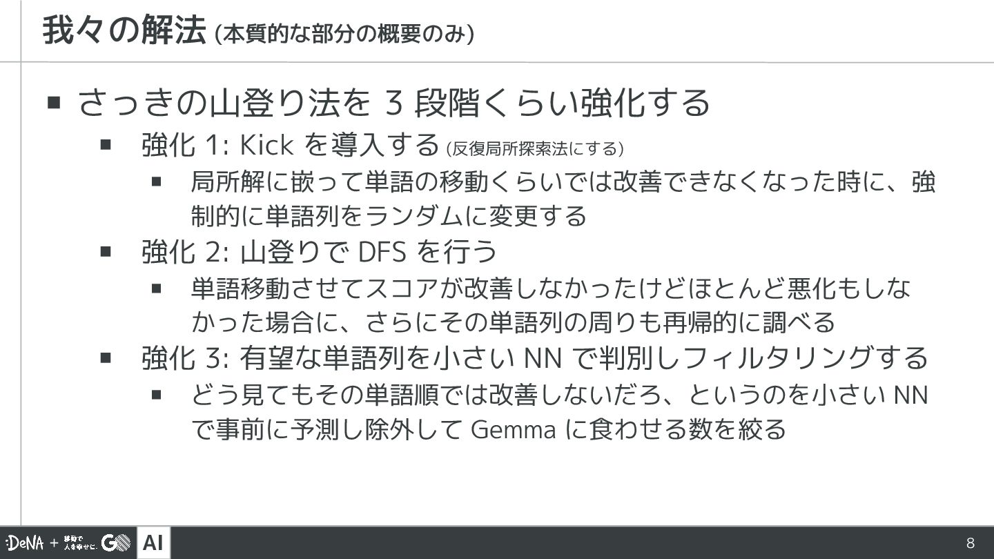 を導入する (反復局所探索法にする) ▪ 局所解に嵌って単語の移動くらいでは改善できなくなった時に、強 制的に単語列をランダムに変更する ▪ 強化 2: 山登りで DFS を行う ▪ 単語移動させてスコアが改善しなかったけどほとんど悪化もしな かった場合に、さらにその単語列の周りも再帰的に調べる ▪ 強化 3: 有望な単語列を小さい NN で判別しフィルタリングする ▪ どう見てもその単語順では改善しないだろ、というのを小さい NN で事前に予測し除外して Gemma に食わせる数を絞る 我々の解法 (本質的な部分の概要のみ)