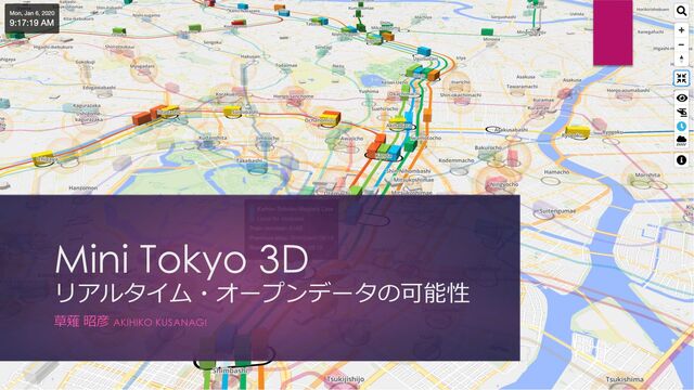 Mini Tokyo 3D は東京の公共交通のリアルタイム3Dマップです。今、実際に動いている列車や発着している旅客機をリアルな3Dマップ上に滑らかなアニメーションで表現します。これは、現実世界とそっくりな双子をデジタルの世界に表現した「デジタルツイン」です。