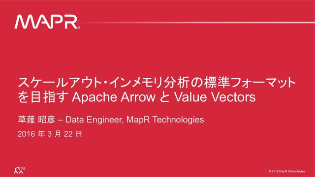 Apache Drill でも使われているインメモリデータ形式 Value Vectors の発展型として 2016年2月に登場した Apache Arrow プロジェクト。その背景とプロジェクトが目指すゴール、データ構造などをご紹介します。2016年3月22日に開催されたTokyo Apache Drill Meetupでの講演資料です。