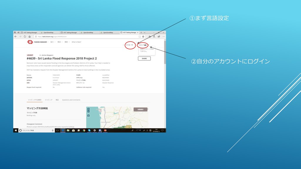①まず言語設定 ②自分のアカウントにログイン