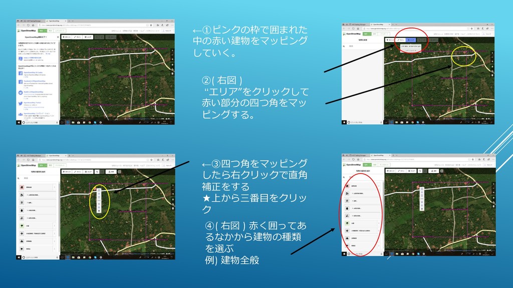 ←①ピンクの枠で囲まれた 中の赤い建物をマッピング していく。 ②( 右図 ) “エリア”をクリックして 赤い部分の四つ角をマッ ピングする。 ←③四つ角をマッピング