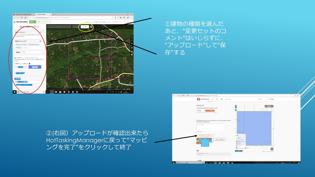 ①建物の種類を選んだ あと、“変更セットのコ メント”はいじらずに、 “アップロード”して“保 存”する ②(右図)アップロードが確認出来たら HotTaskingManagerに戻って“マッピ ングを完了”をクリックして終了