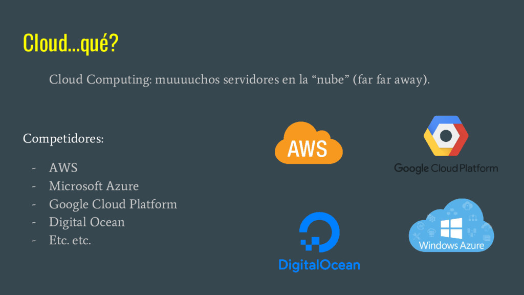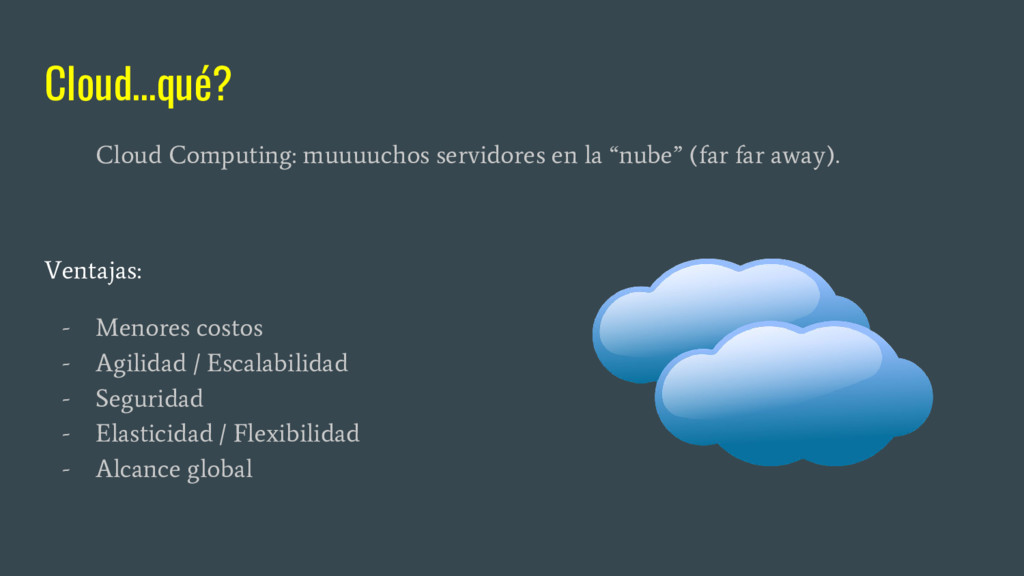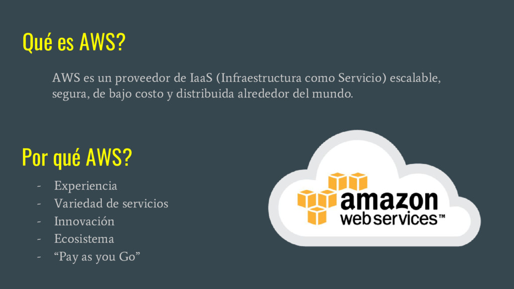 como Servicio) escalable, segura, de bajo costo y distribuida alrededor del mundo. Por qué AWS? - Experiencia - Variedad de servicios - Innovación - Ecosistema - “Pay as you Go”