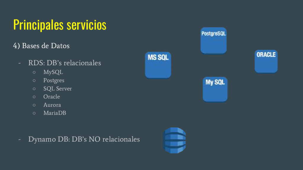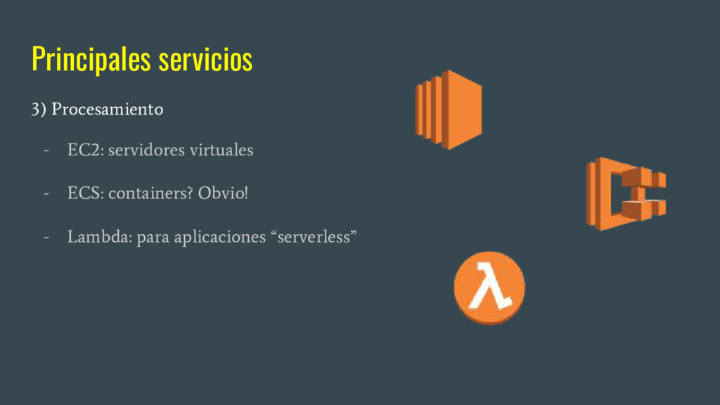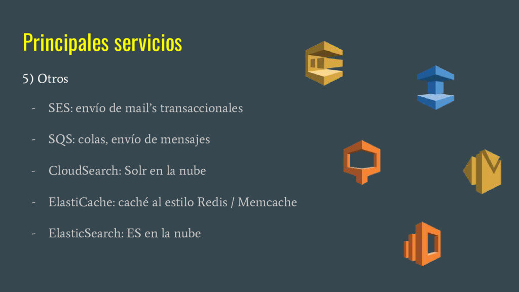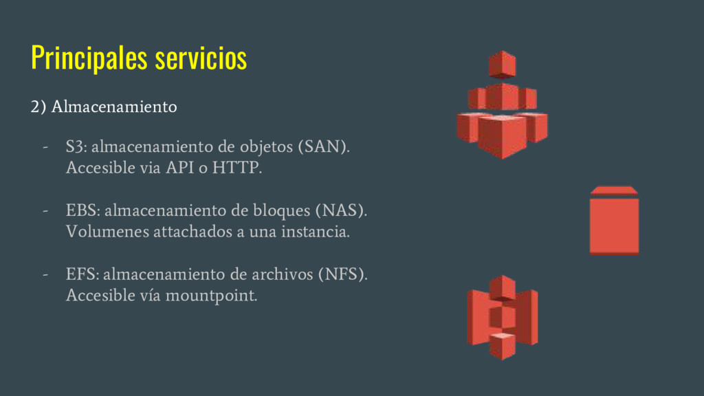 Accesible via API o HTTP. - EBS: almacenamiento de bloques (NAS). Volumenes attachados a una instancia. - EFS: almacenamiento de archivos (NFS). Accesible vía mountpoint.