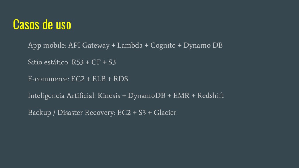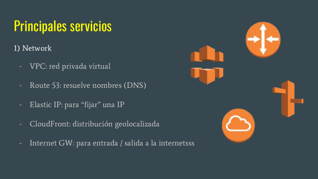 Route 53: resuelve nombres (DNS) - Elastic IP: para “fijar” una IP - CloudFront: distribución geolocalizada - Internet GW: para entrada / salida a la internetsss