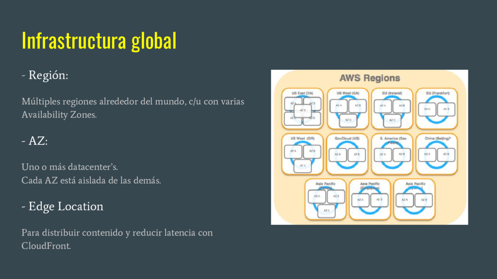 con varias Availability Zones. - AZ: Uno o más datacenter’s. Cada AZ está aislada de las demás. - Edge Location Para distribuir contenido y reducir latencia con CloudFront.