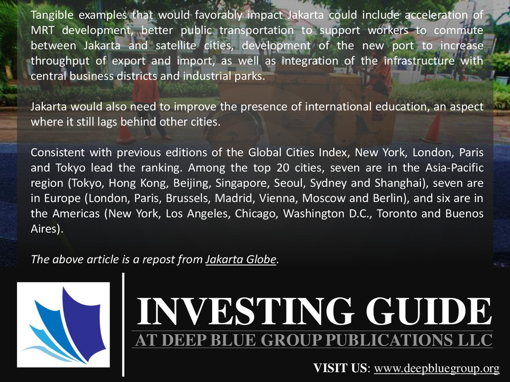 Jakarta. New York and London remain the world’s most global cities, while select emerging-market cities led by Jakarta, Manila and Addis Ababa strengthened their ability to challenge global leaders in the next 10 to 20 years, according to this year’s Global Cities Index issued by management consulting firm A.T. Kearney.