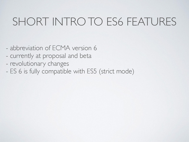 } var e = new Employee(); console.log(e.doWork()); //Complete class Employee { constructor(){ console.log(“Complete”); } } var e = new Employee(); // Complete Constructor Setter and Getter class Employee { set name(n){ this._name = n; } get name(){ return this._name;} } var e = new Employee(); e.name = "Slack"; console.log(e.name); //Slack