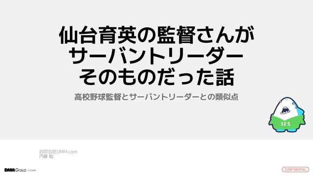 メンバーのモチベーション向上 チームのエンゲージメント向上 結果、組織の生産性・パフォーマンスも向上 日本一からの招待 チーム作りは文化作り 人材流動性に耐えるもの (文化) 日本一からの招待 全員の幸福度を高める 強い モチベーション つまり、サーバントリーダーとは、 メンバーをモチベートし、よい振る舞いを「組織の当たり前」まで落とし込む人、 それらを考え、実践できる人のこと 「幸福度を高める」取り組み 面白い野球, 日本一激しいチーム内競争, 人生は敗者復活戦(ふりかえり),1on1, 傾聴, 相 談役, 「どう?」問いかけ, 写真入り選手名鑑, 選手PV作成, リモート会議 「チーム作りは文化作り」取り組み 最上級生が手本を示す, 伝承試合, 定期的な注意喚起, 事実ベースの評価, まとめるではな く、まとまる, 優しさは想像力, 繰り返し伝える, 徹底した言語化