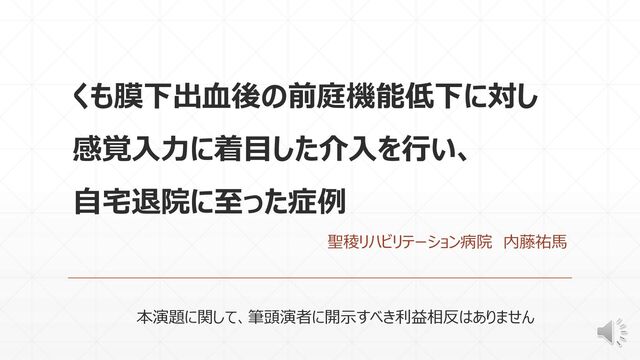 くも膜下出血後の前庭機能低下に対し 感覚入力に着目した介入を行い、 自宅退院に至った症例 聖稜リハビリテーション病院 内藤祐馬 本演題に関して、筆頭演者に開示すべき利益相反はありません