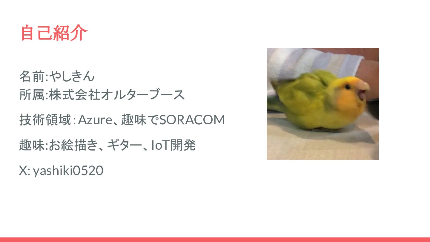 自己紹介 名前:やしきん 所属:株式会社オルターブース 技術領域:Azure、趣味でSORACOM 趣味:お絵描き、ギター、IoT開発 X: yashiki0520