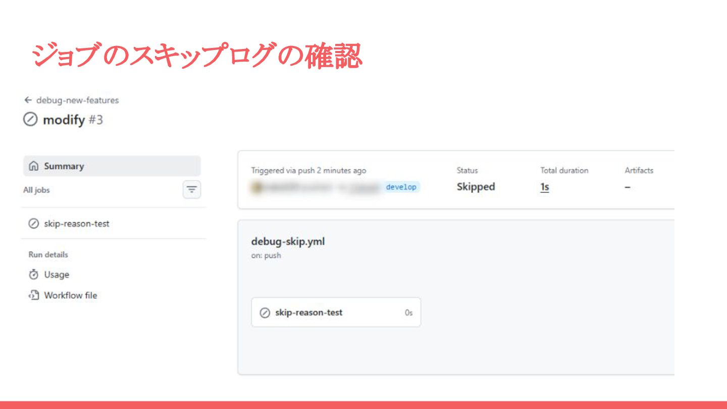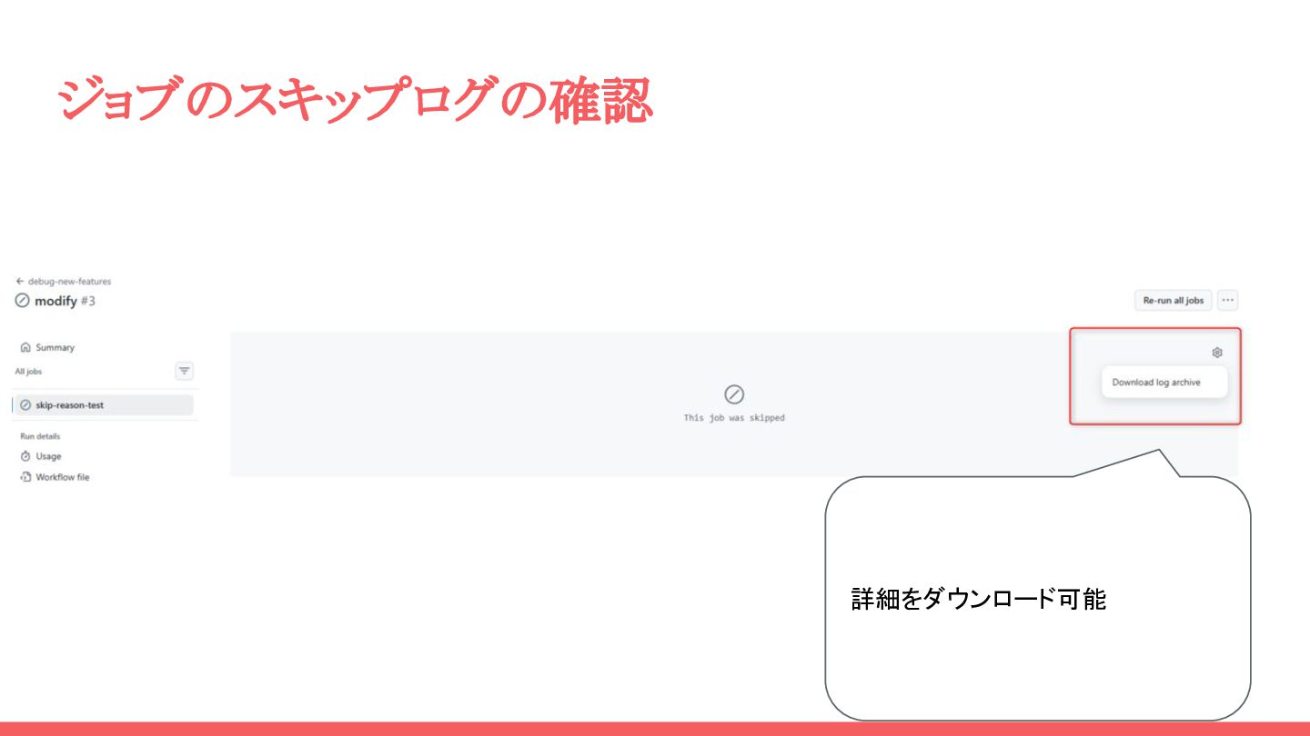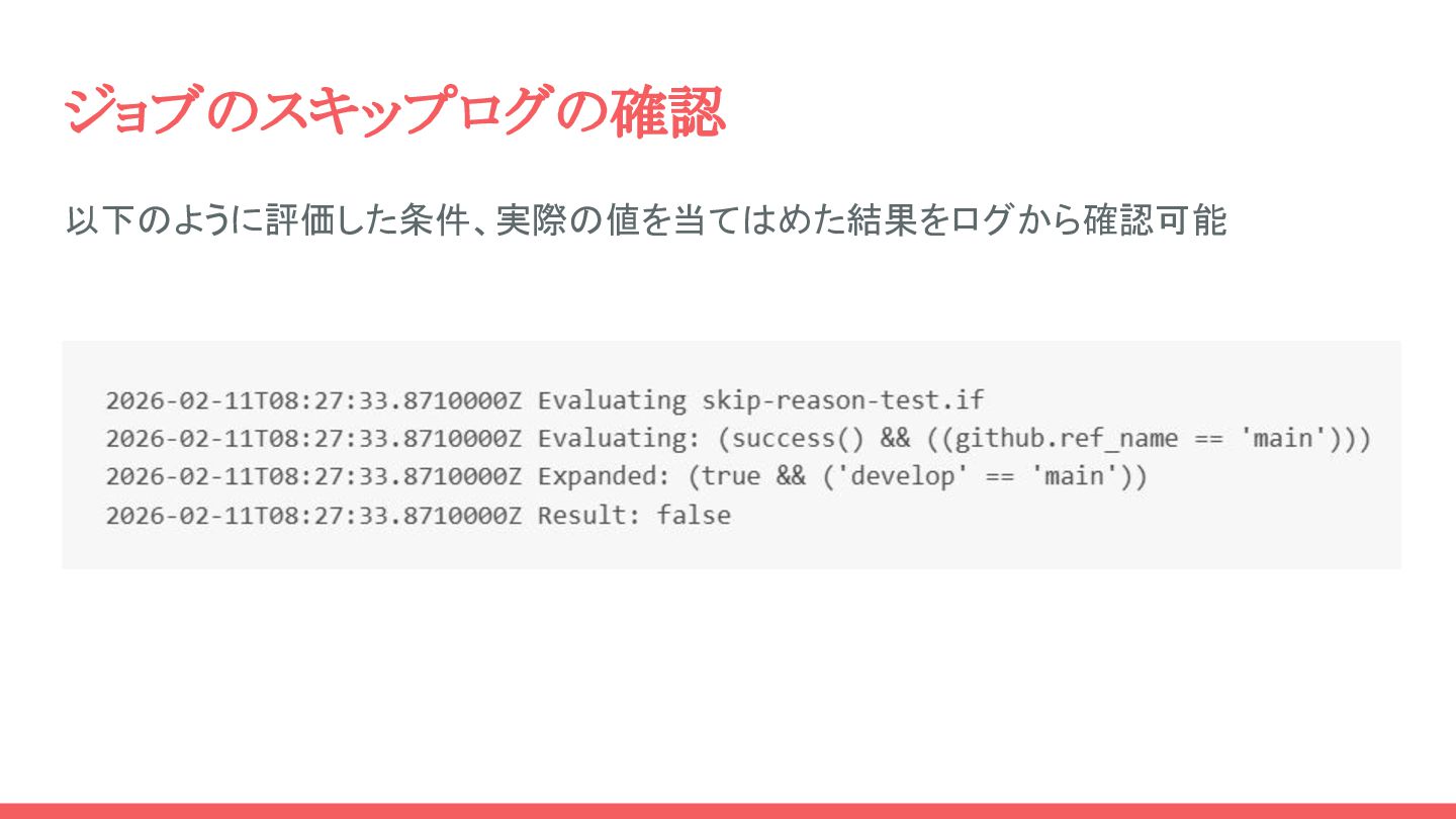 ジョブのスキップログの確認 以下のように評価した条件、実際の値を当てはめた結果をログから確認可能