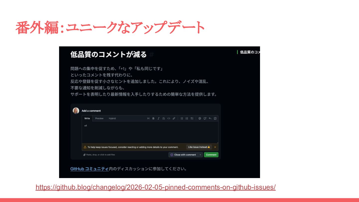 番外編:ユニークなアップデート https://github.blog/changelog/2026-02-05-pinned-comments-on-github-issues/