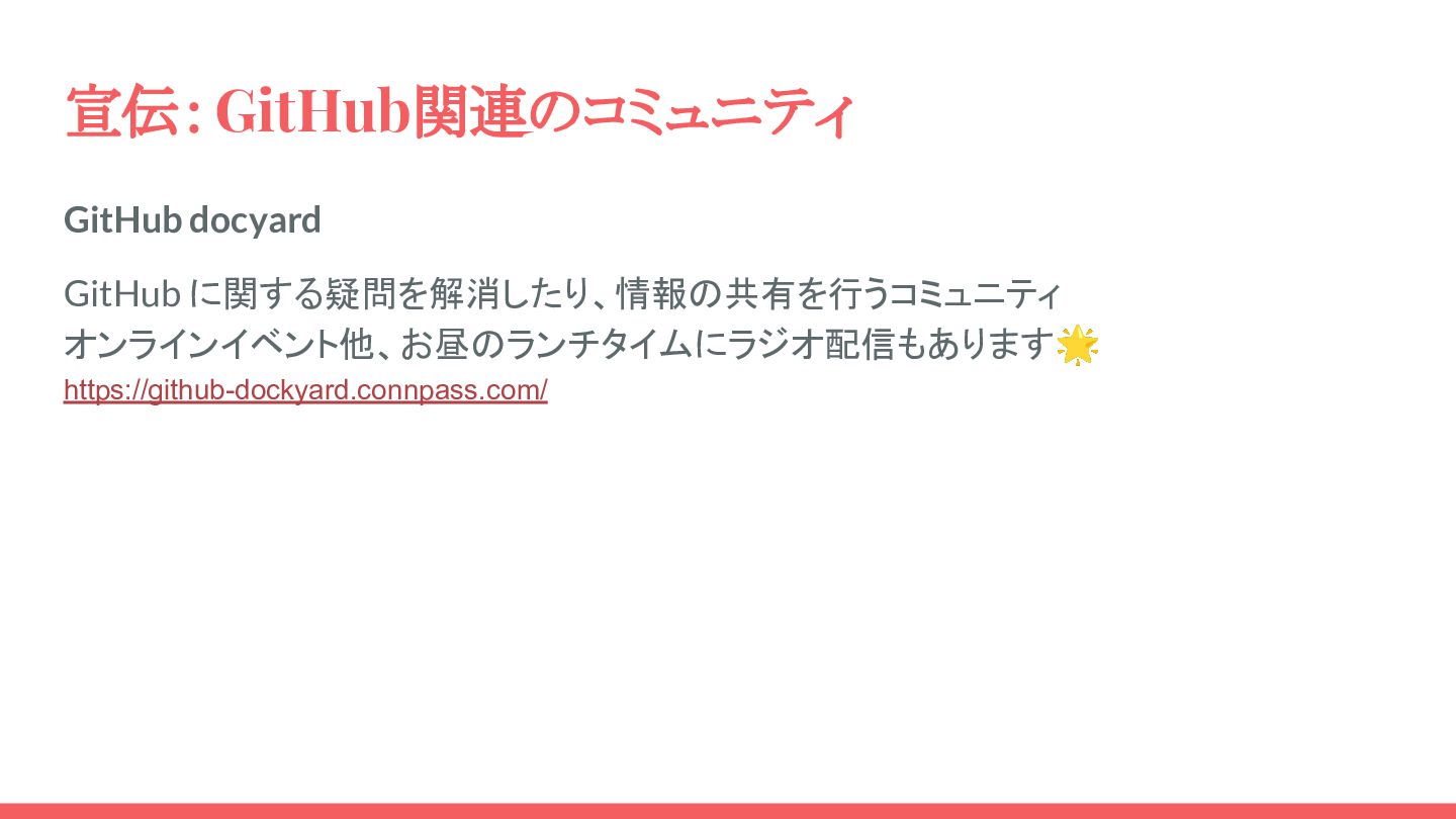 宣伝:GitHub関連のコミュニティ GitHub docyard GitHub に関する疑問を解消したり、情報の共有を行うコミュニティ オンラインイベント他、お昼のランチタイムにラジオ配信もあります🌟 https://github-dockyard.connpass.com/