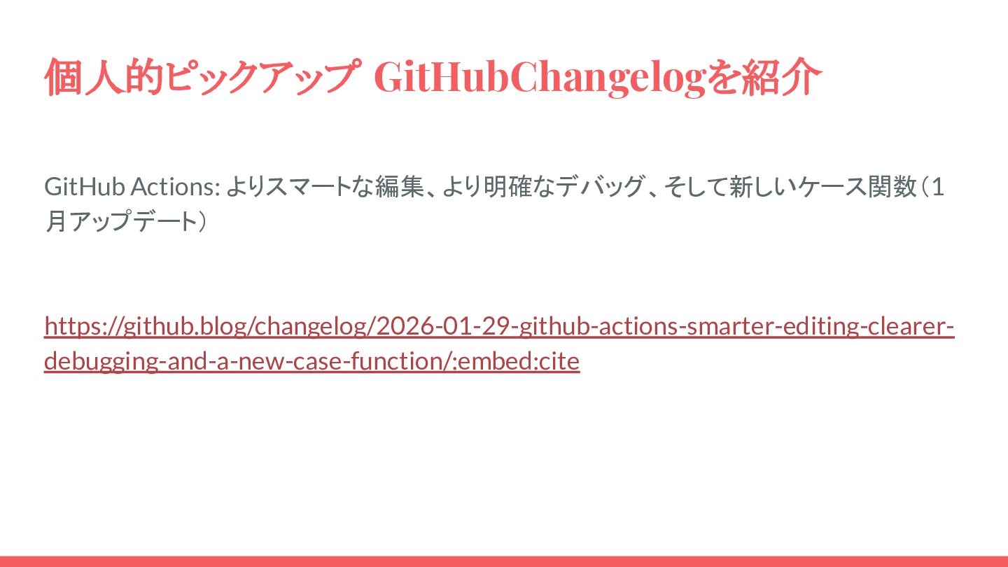 個人的ピックアップ GitHubChangelogを紹介 GitHub Actions: よりスマートな編集、より明確なデバッグ、そして新しいケース関数(1 月アップデート) https://github.blog/changelog/2026-01-29-github-actions-smarter-editing-clearer- debugging-and-a-new-case-function/:embed:cite