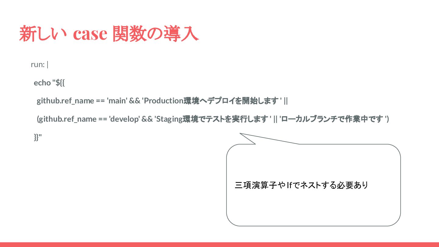 新しい case 関数の導入 run: | echo "${{ case(github.ref_name == 'main',
