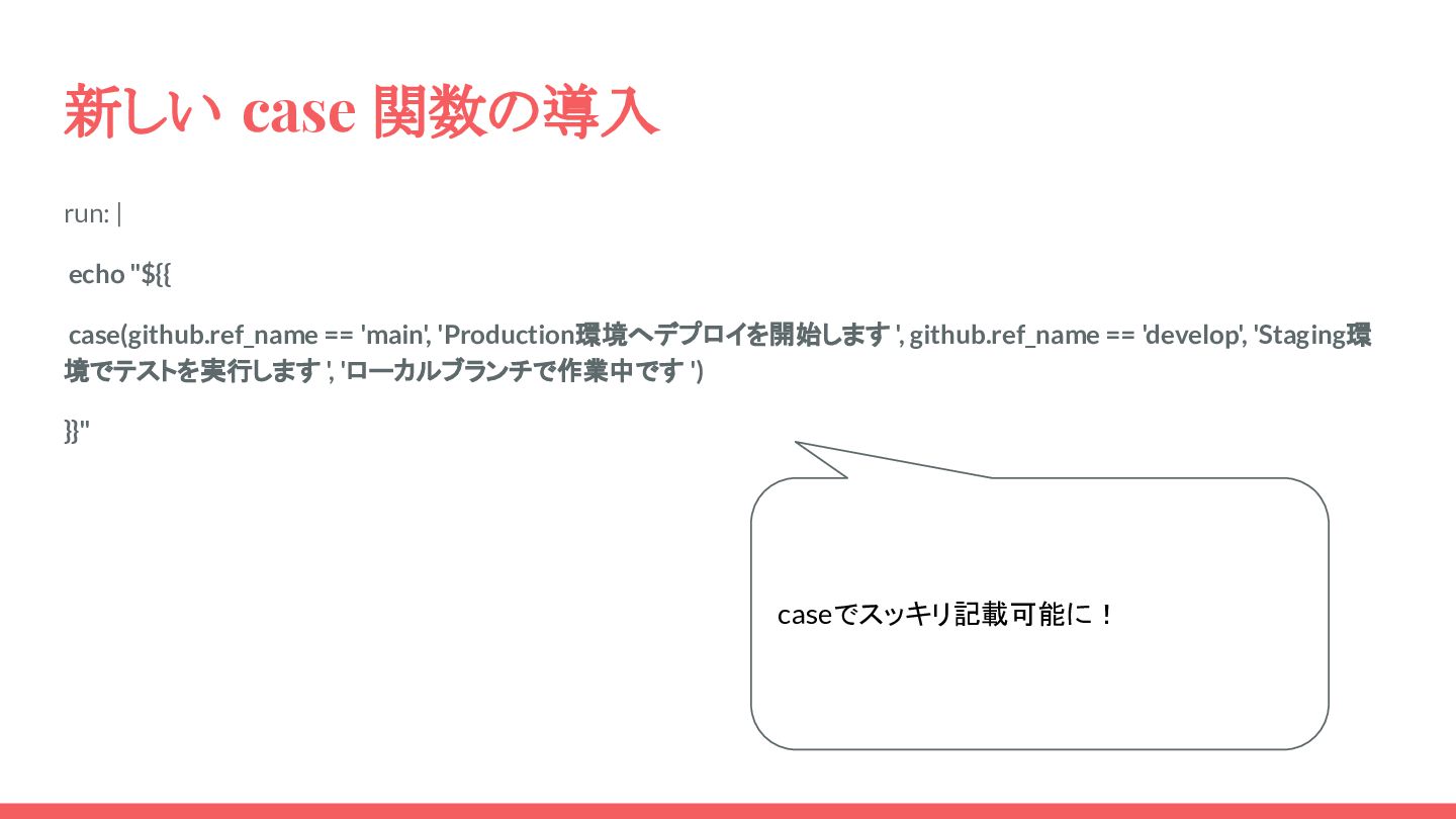 'Production環境へデプロイを開始します ', github.ref_name == 'develop', 'Staging環 境でテストを実行します ', 'ローカルブランチで作業中です ') }}" caseでスッキリ記載可能に!