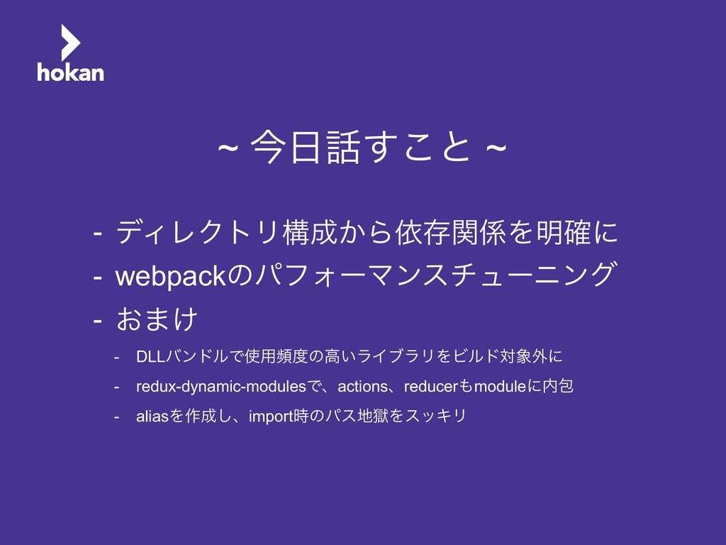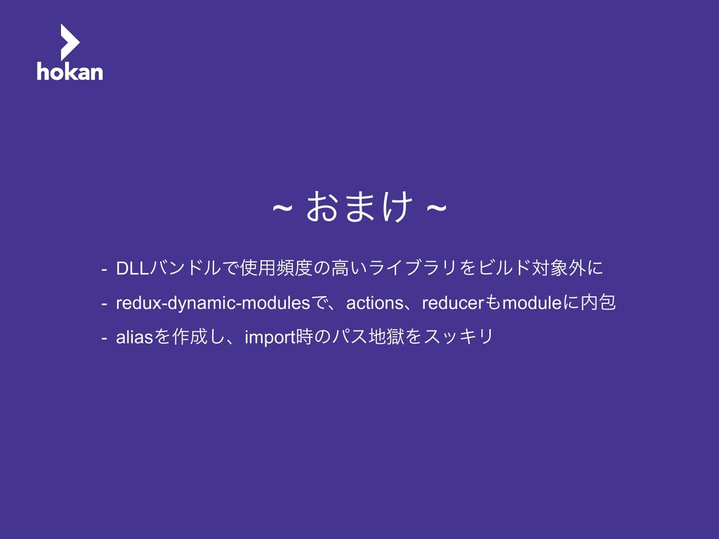 ~ ͓·͚ ~ - DLLόϯυϧͰ༻සͷߴ͍ϥΠϒϥϦΛϏϧυର֎ʹ - redux-dynamic-modulesͰɺactionsɺreducermoduleʹแ - aliasΛ࡞͠ɺimport࣌ͷύεࠈΛεοΩϦ