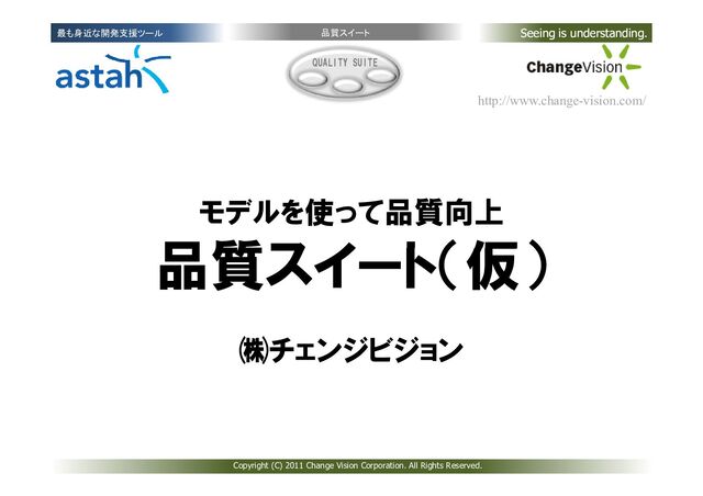 品質スイート モデルを使って品質向上 品質スイート(仮) Copyright (C) 2011 Change Vision Corporation. All Rights Reserved. 品質スイート(仮) ㈱チェンジビジョン