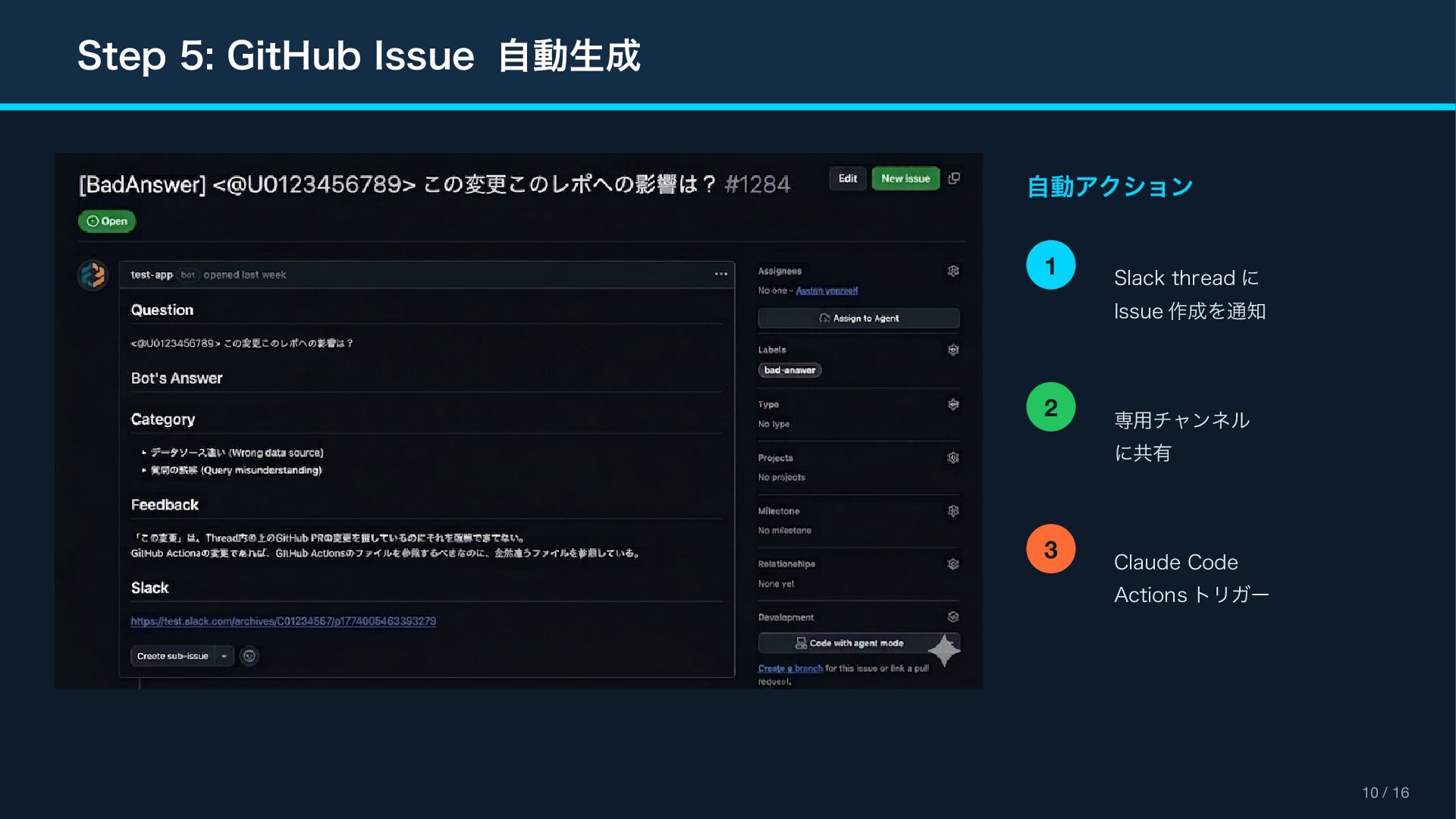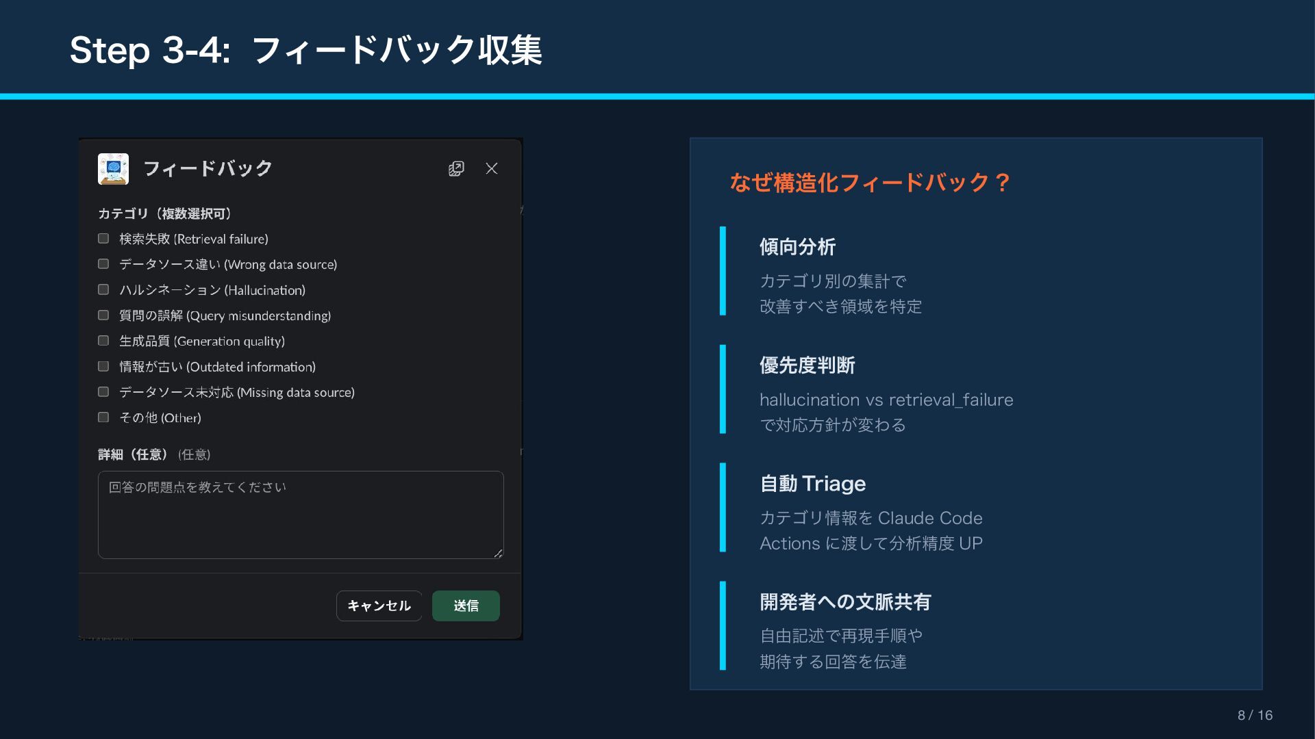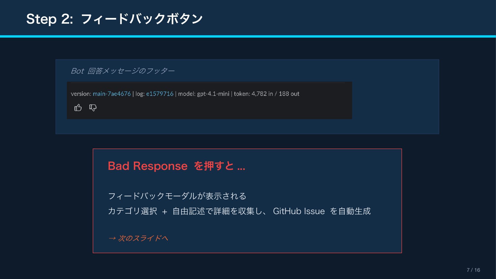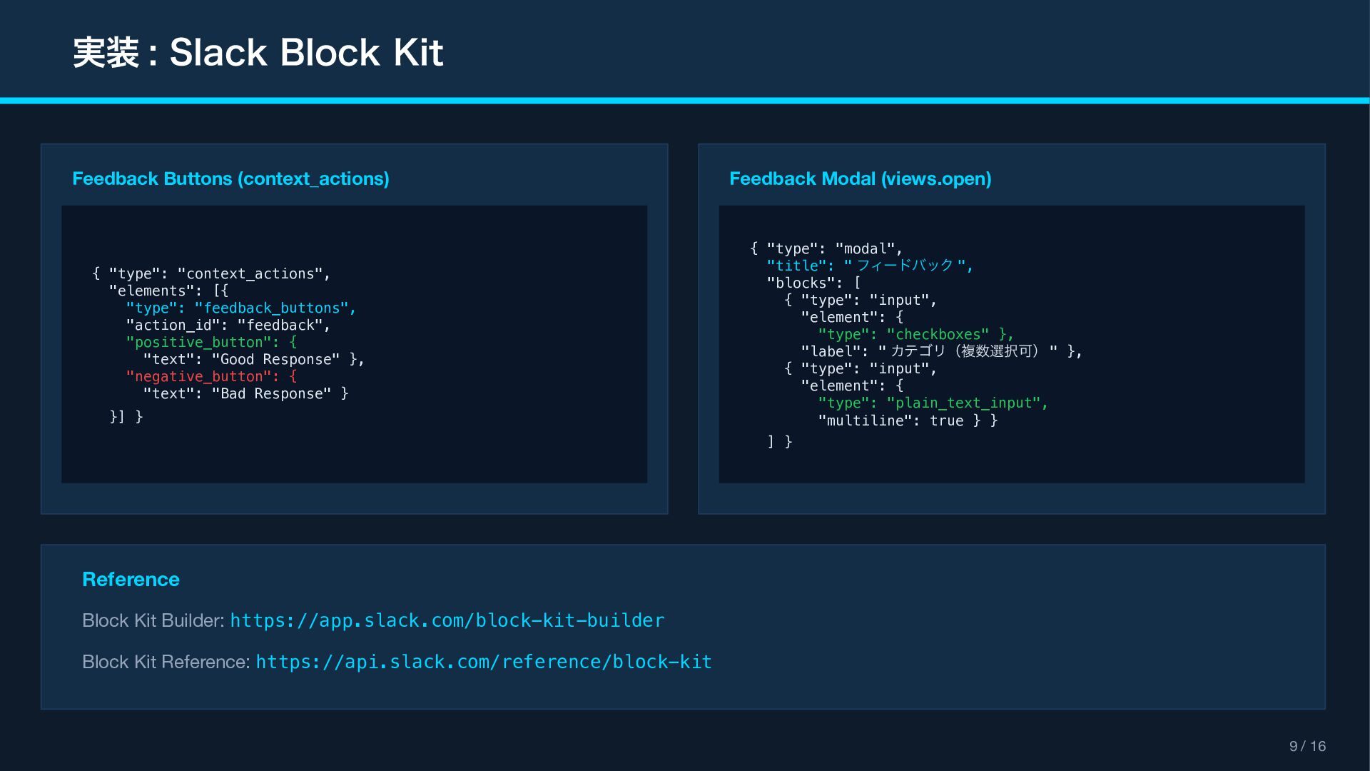 (context_actions) { "type": "context_actions", "elements": [{ "type": "feedback_buttons", "action_id": "feedback", "positive_button": { "text": "Good Response" }, "negative_button": { "text": "Bad Response" } }] } Feedback Modal (views.open) { "type": "modal", "title": " フィードバック ", "blocks": [ { "type": "input", "element": { "type": "checkboxes" }, "label": " カテゴリ(複数選択可) " }, { "type": "input", "element": { "type": "plain_text_input", "multiline": true } } ] } Reference Block Kit Builder: https://app.slack.com/block-kit-builder Block Kit Reference: https://api.slack.com/reference/block-kit