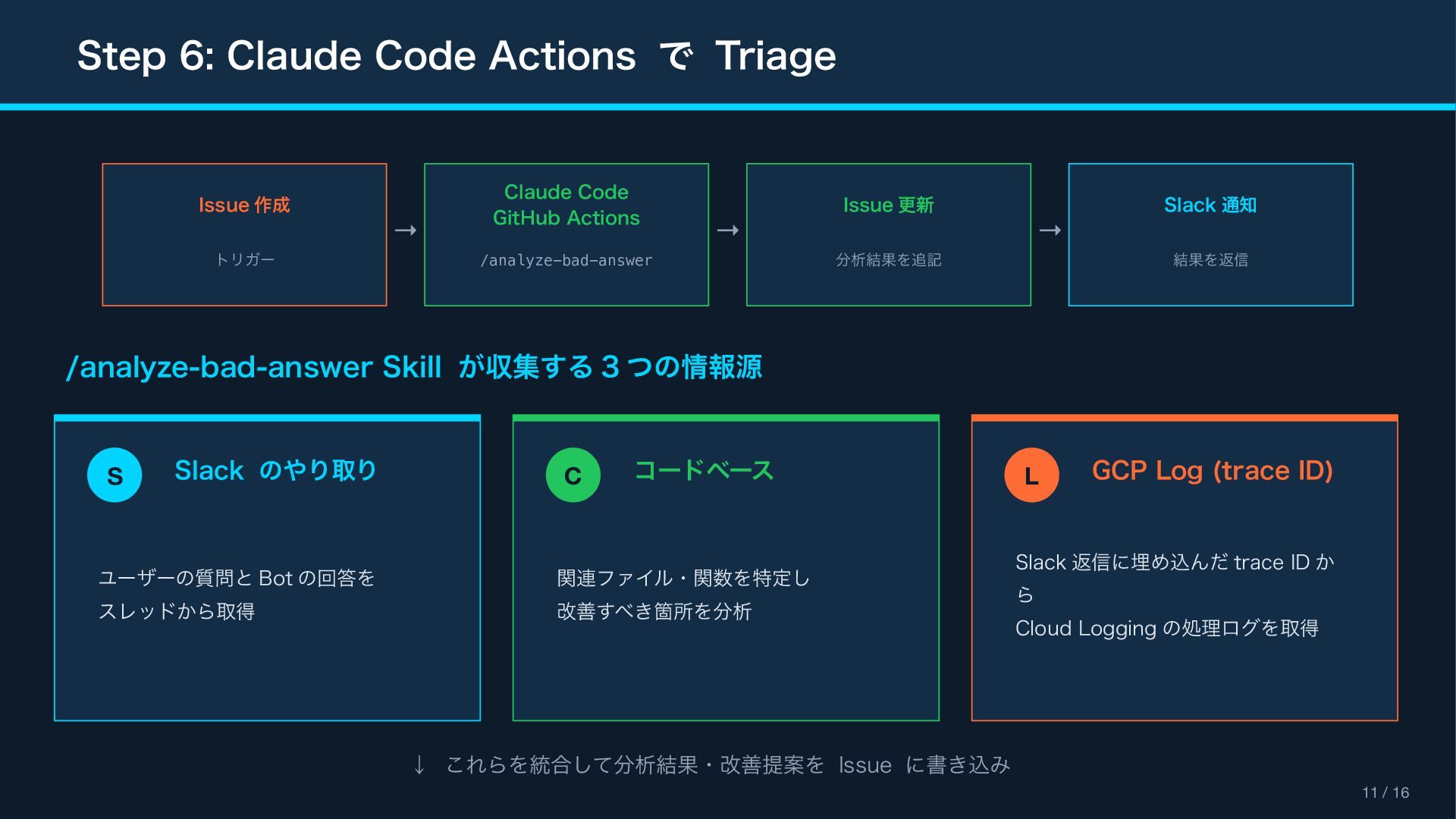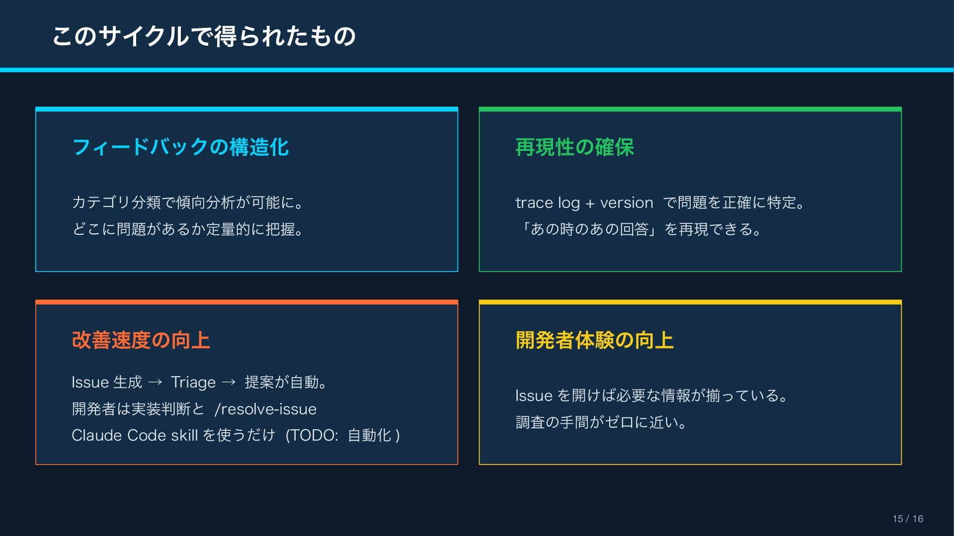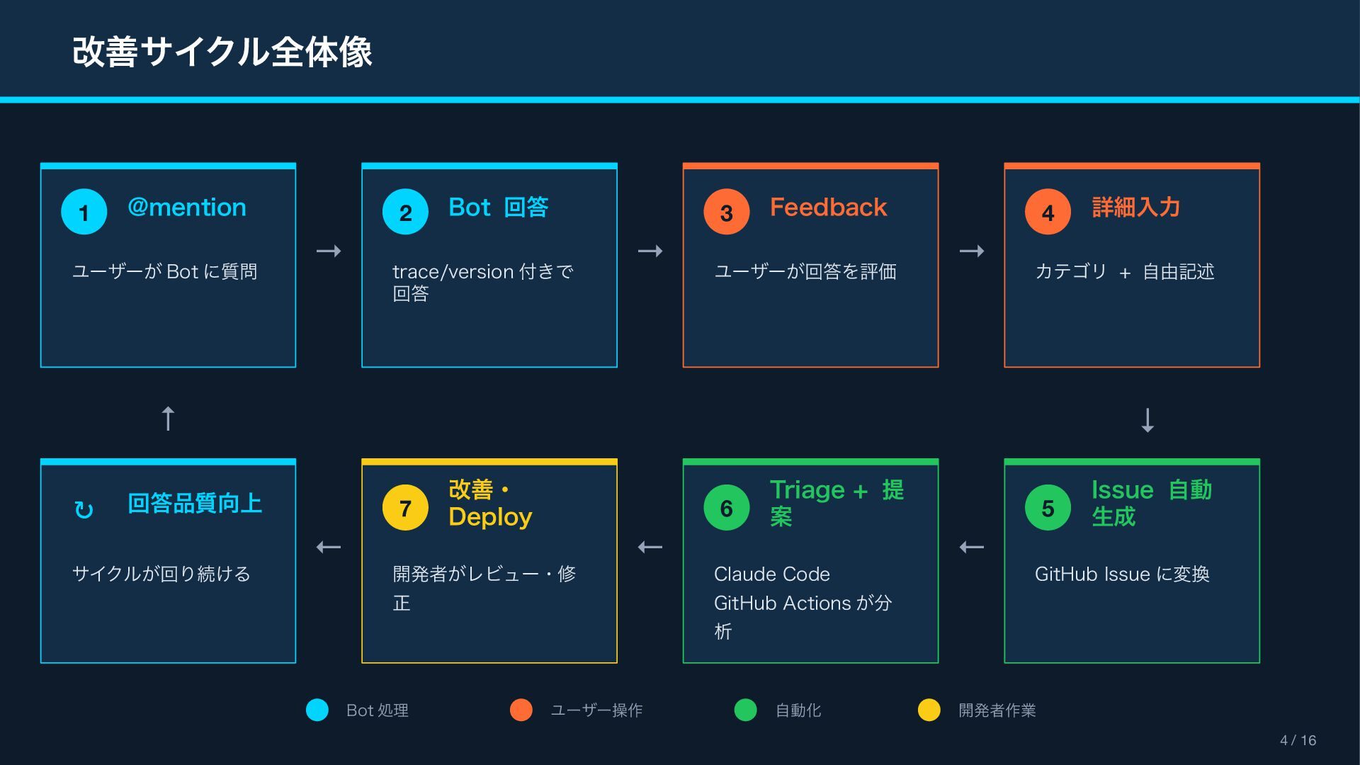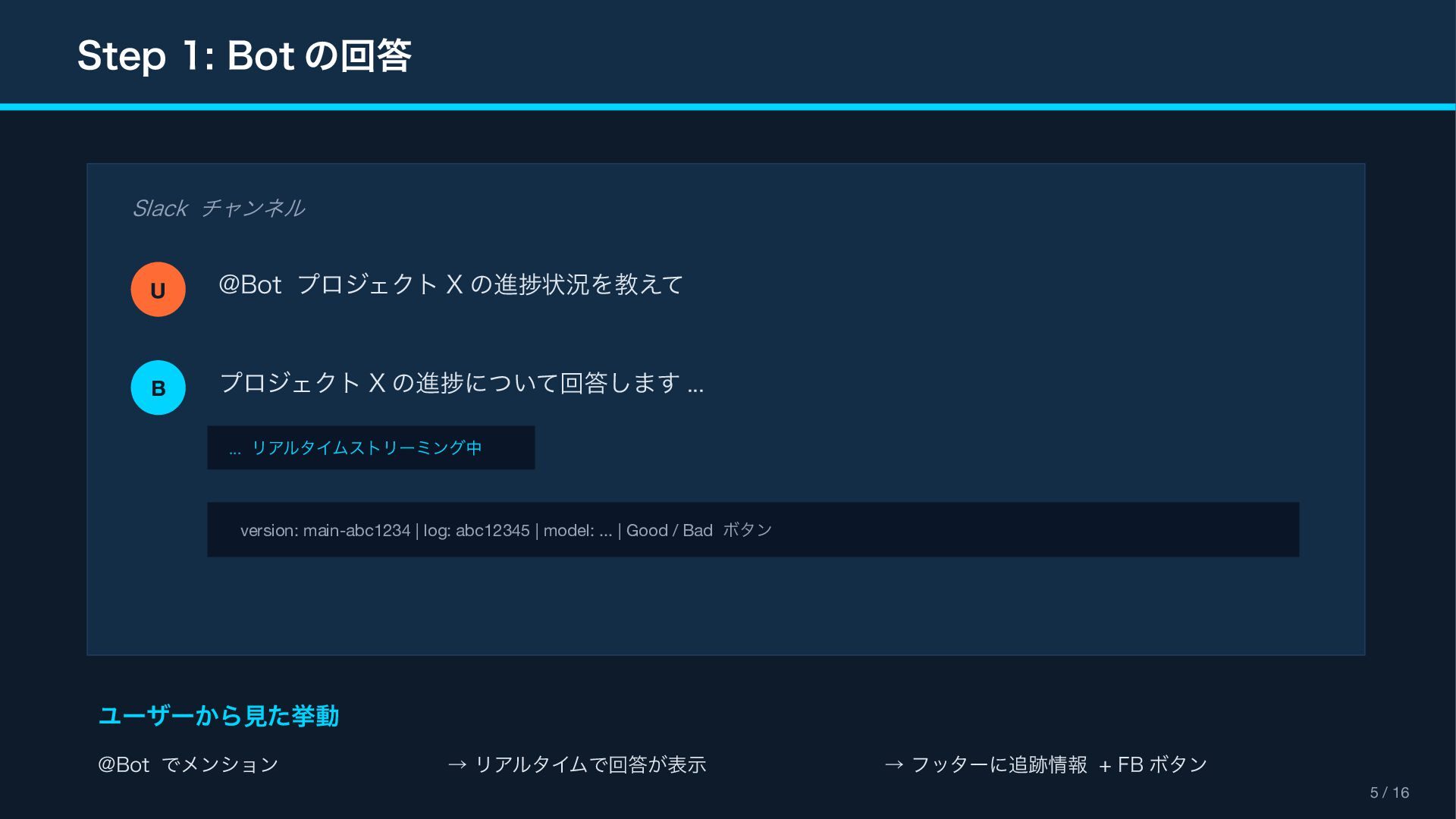(context_actions) { "type": "context_actions", "elements": [{ "type": "feedback_buttons", "action_id": "feedback", "positive_button": { "text": "Good Response" }, "negative_button": { "text": "Bad Response" } }] } Feedback Modal (views.open) { "type": "modal", "title": " フィードバック ", "blocks": [ { "type": "input", "element": { "type": "checkboxes" }, "label": " カテゴリ(複数選択可) " }, { "type": "input", "element": { "type": "plain_text_input", "multiline": true } } ] } Reference Block Kit Builder: https://app.slack.com/block-kit-builder Block Kit Reference: https://api.slack.com/reference/block-kit