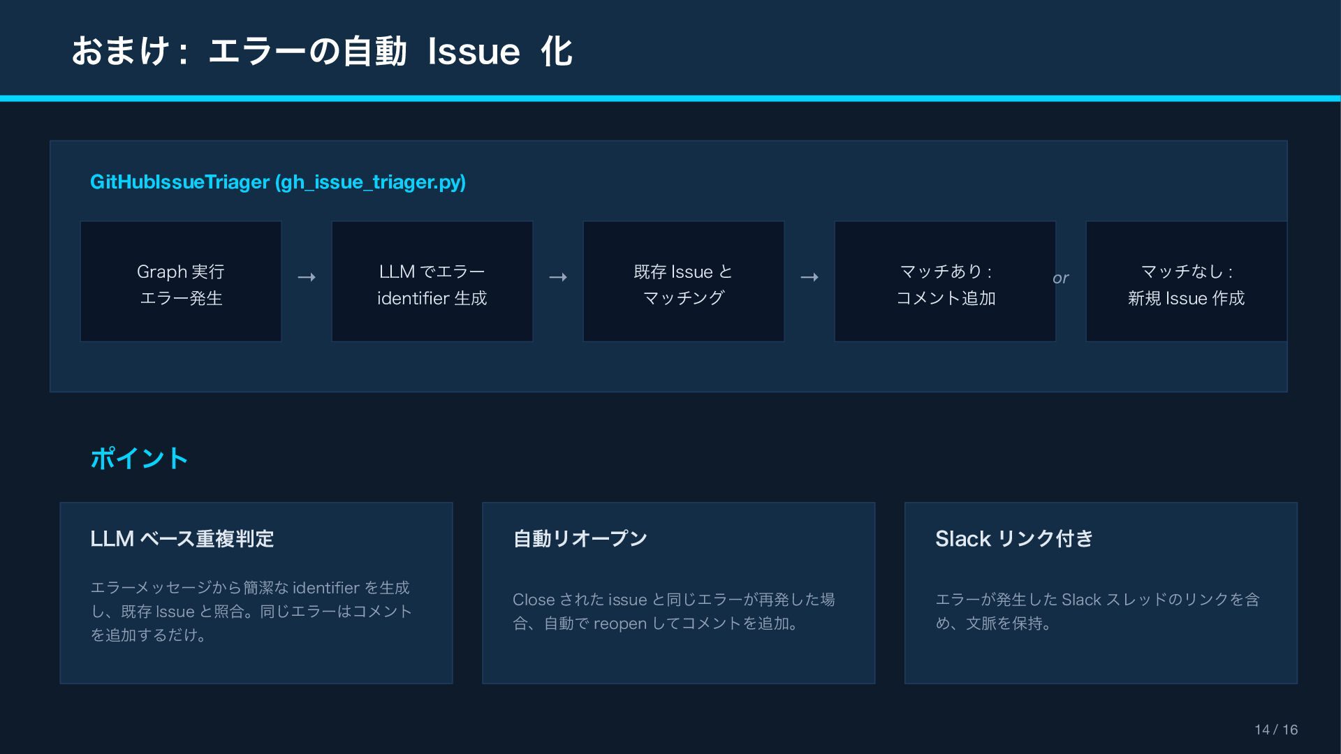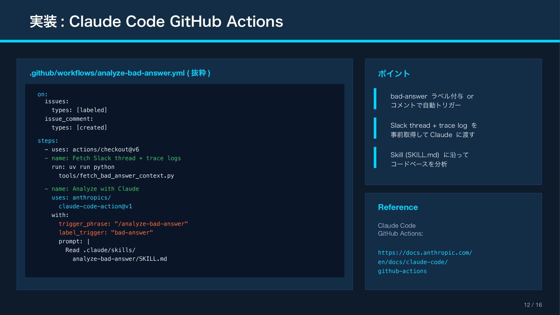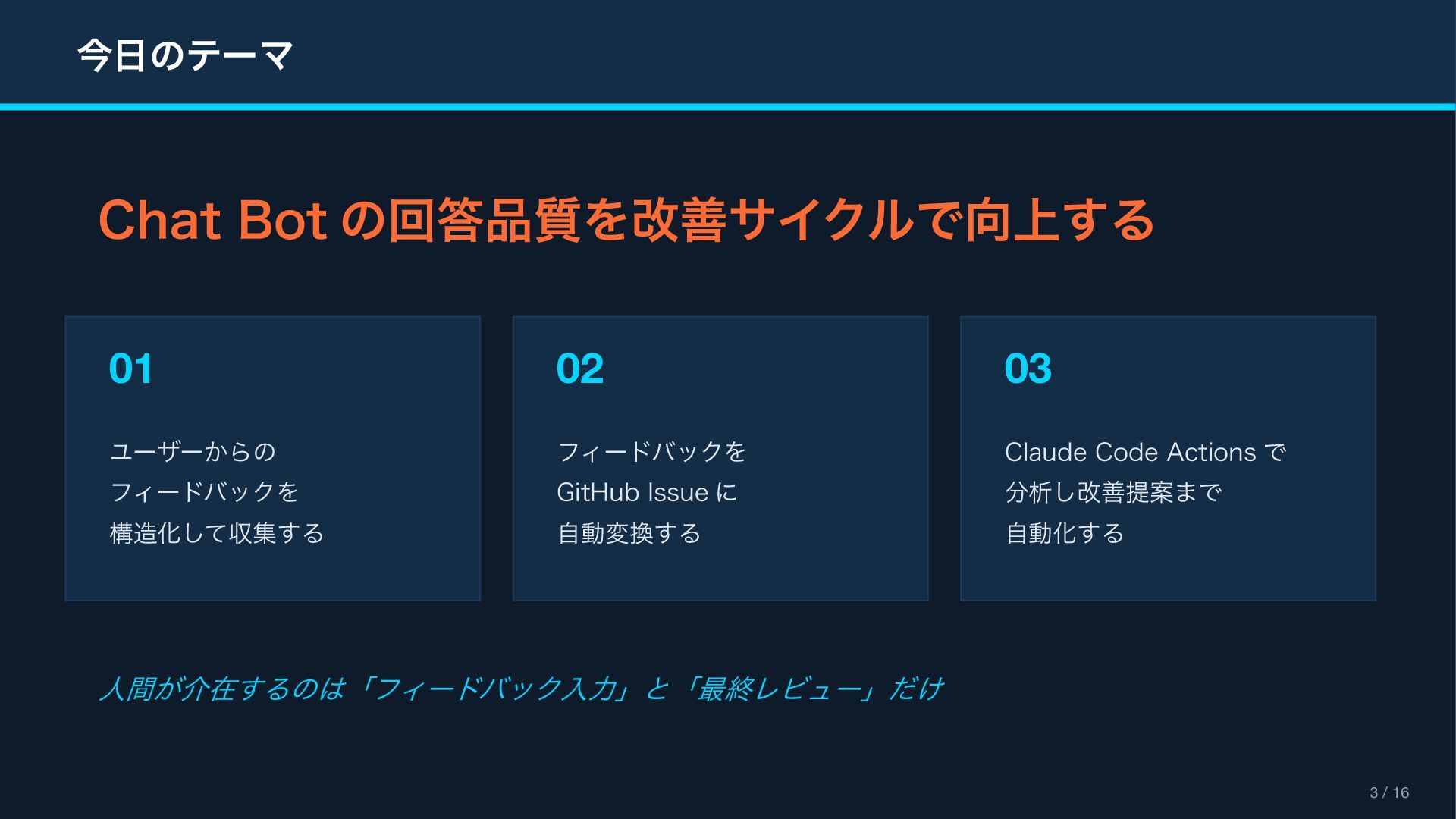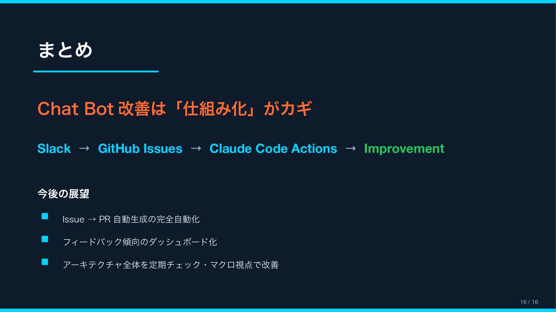 (context_actions) { "type": "context_actions", "elements": [{ "type": "feedback_buttons", "action_id": "feedback", "positive_button": { "text": "Good Response" }, "negative_button": { "text": "Bad Response" } }] } Feedback Modal (views.open) { "type": "modal", "title": " フィードバック ", "blocks": [ { "type": "input", "element": { "type": "checkboxes" }, "label": " カテゴリ(複数選択可) " }, { "type": "input", "element": { "type": "plain_text_input", "multiline": true } } ] } Reference Block Kit Builder: https://app.slack.com/block-kit-builder Block Kit Reference: https://api.slack.com/reference/block-kit