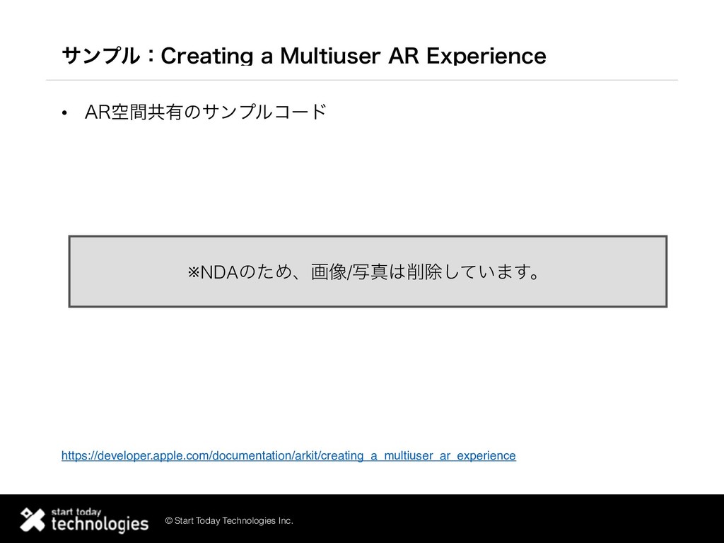 © Start Today Technologies Inc. αϯϓϧɿ$SFBUJOHB.VMUJVTFS"3&YQFSJFODF • "3ۭؒڞ༗ͷαϯϓϧίʔυ https://developer.apple.com/documentation/arkit/creating_a_multiuser_ar_experience ※NDAͷͨΊɺը૾/ࣸਅআ͍ͯ͠·͢ɻ