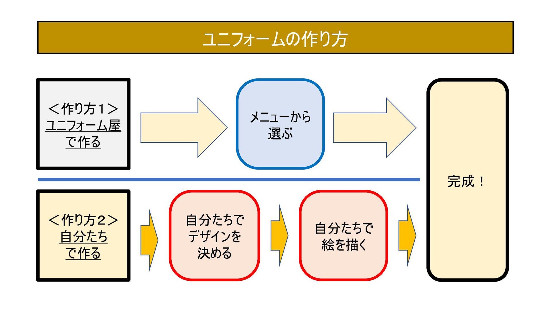 <作り方1> ユニフォーム屋 で作る ユニフォームの作り方 メニューから 選ぶ 完成! <作り方2> 自分たち で作る