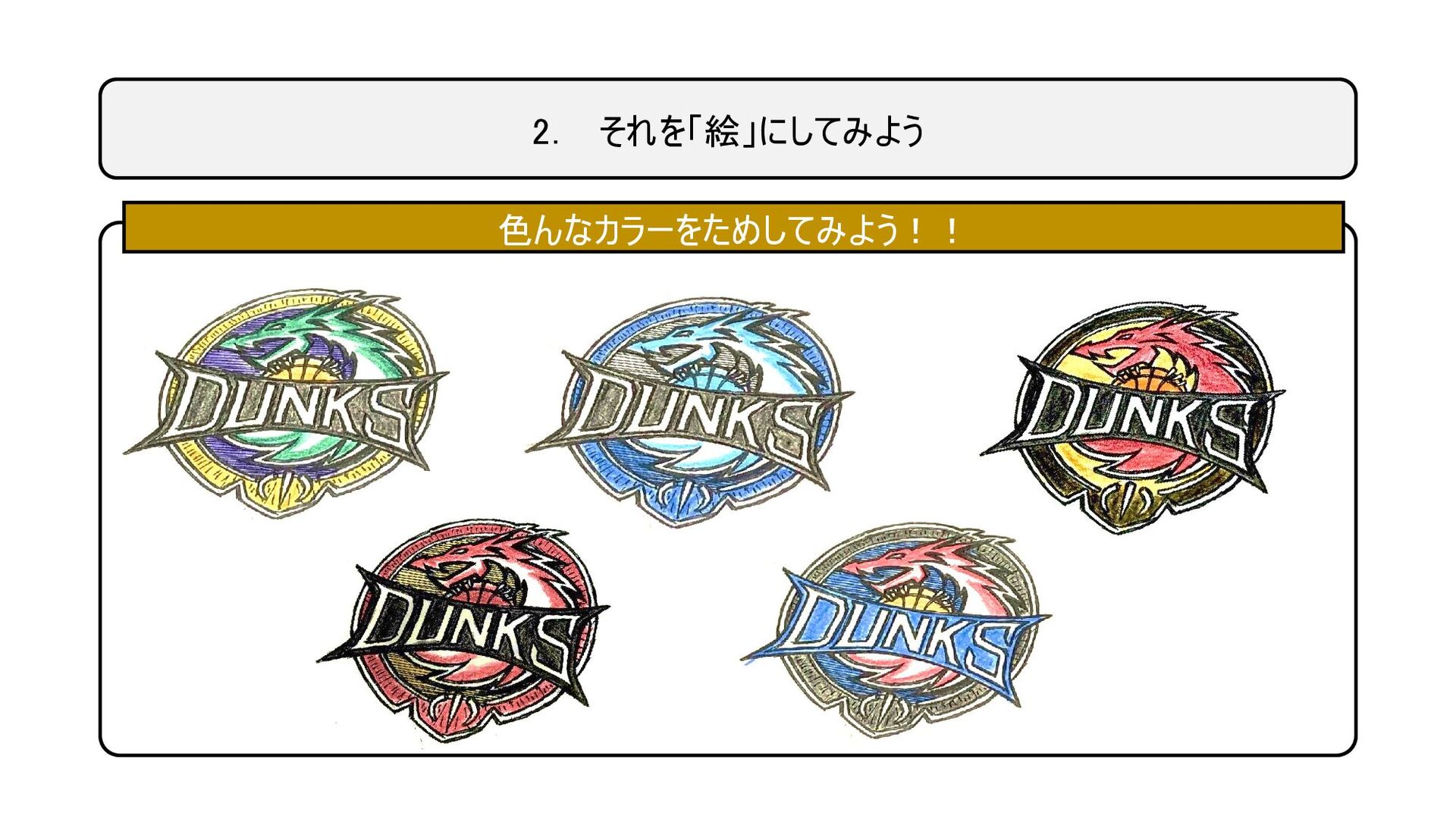 1. ダンクスって、どんなチームなの? 絵にできる(目で見える) 絵にできない ドラゴン 白と黒のユニフォーム 使う色は、黒 / 白 /