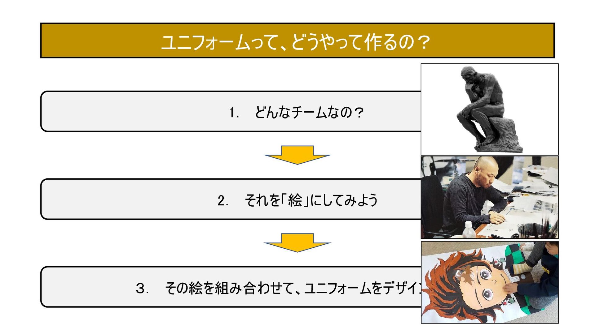 1. どんなチームなの? 2. それを「絵」にしてみよう 3. その絵を組み合わせて、ユニフォームをデザインしよう ユニフォームって、どうやって作るの?