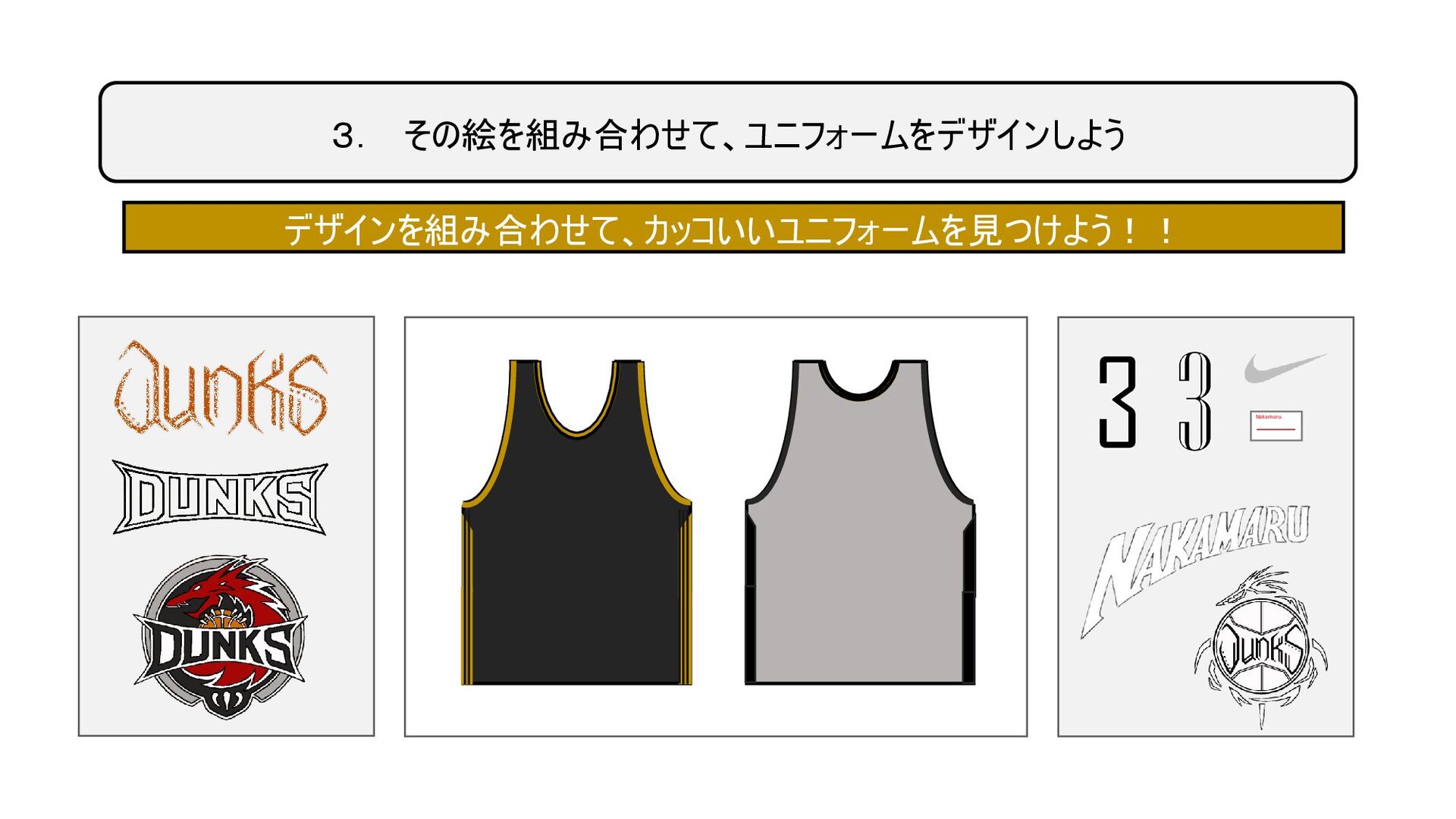 3. その絵を組み合わせて、ユニフォームをデザインしよう Nakamaru 3 デザインを組み合わせて、カッコいいユニフォームを見つけよう!! 3
