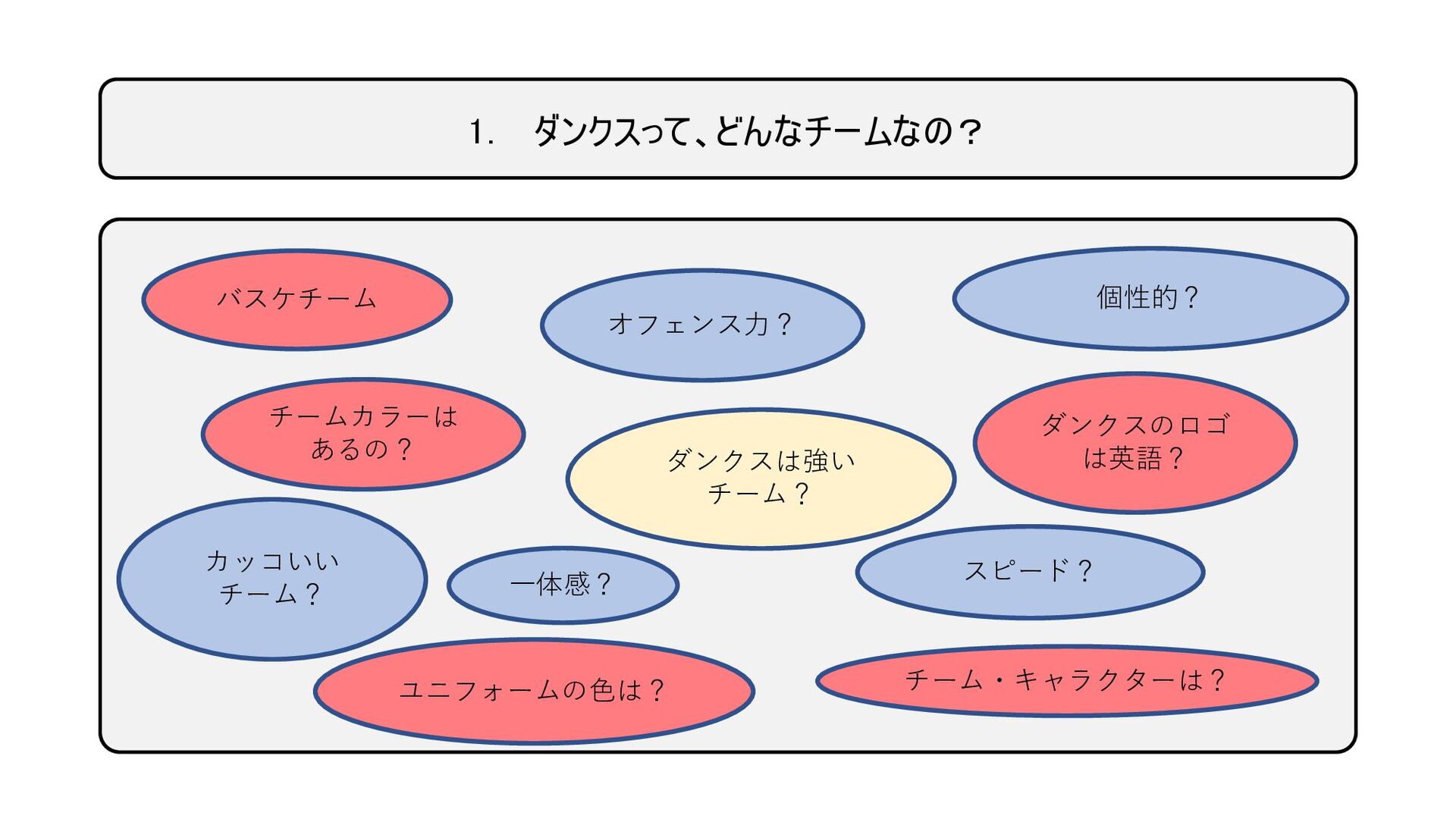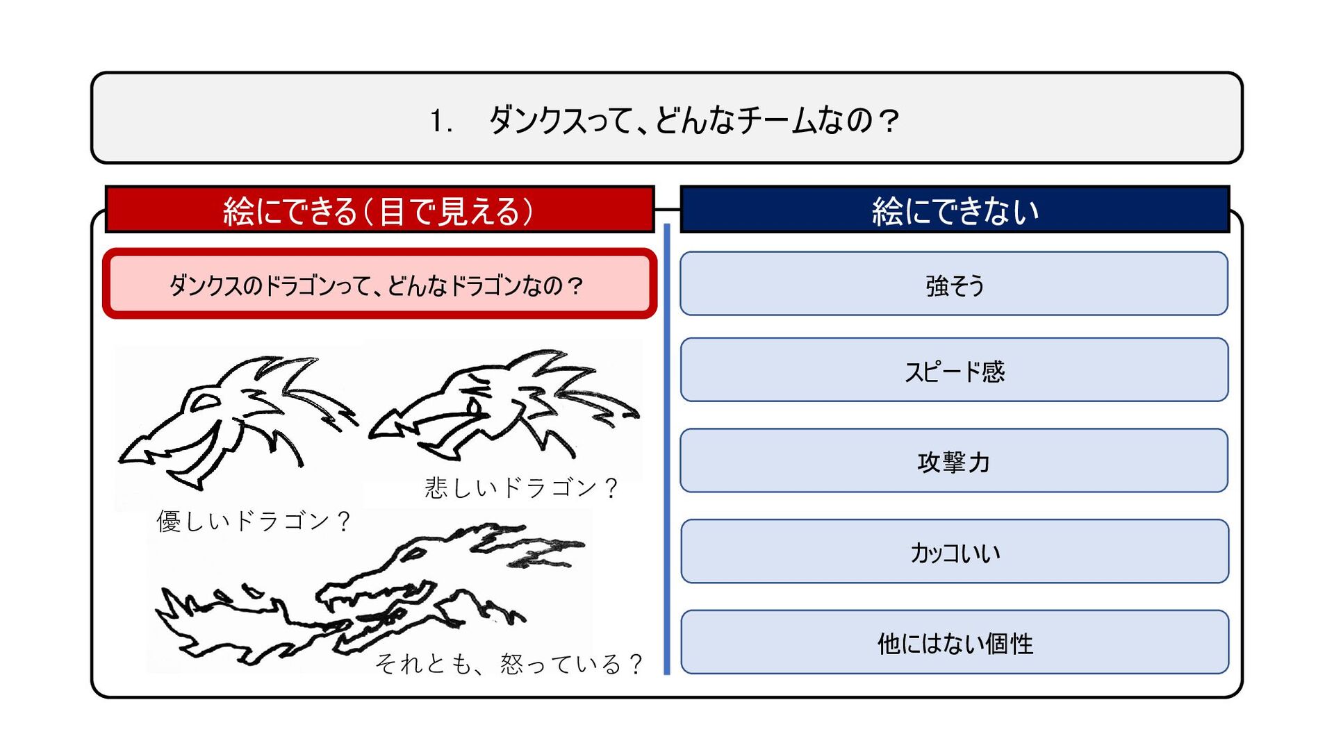 1. ダンクスって、どんなチームなの? 絵にできる(目で見える) 絵にできない ダンクスのドラゴンって、どんなドラゴンなの? 強そう スピード感 攻撃力 カッコいい 他にはない個性