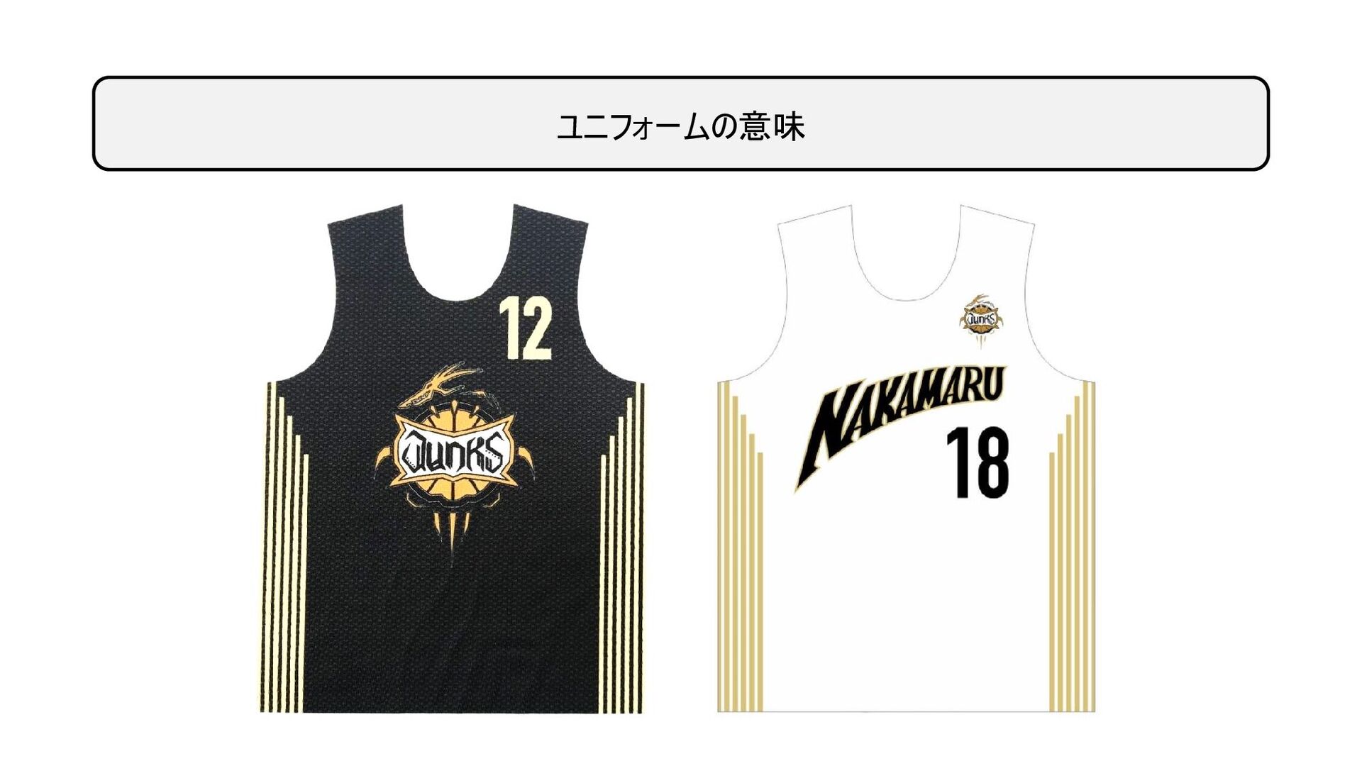 ダンクスだけが知っている、ユニフォームの秘密 • どちらのユニフォームも、使っている色は同じ(黒、白、ゴールド) • 黒は前のユニフォームから歴史をリスペクト。白はフェアプレー、ゴー ルドは勝利(ビクトリー) • ユニフォームのサイドラインは、攻めと守りの一体感を表現