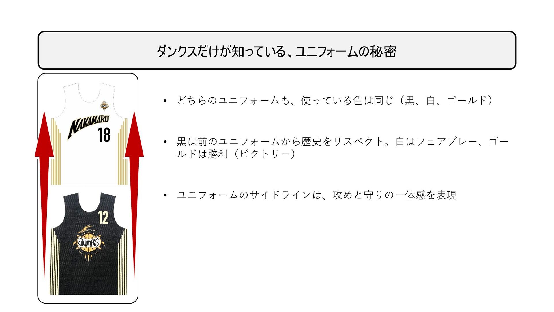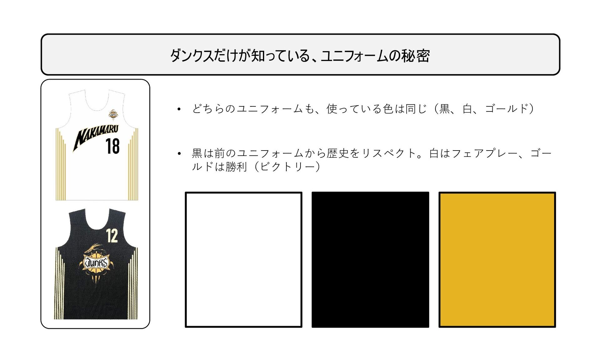 ダンクスだけが知っている、ユニフォームの秘密 • どちらのユニフォームも、使っている色は同じ(黒、白、ゴールド) • 黒は前のユニフォームから歴史をリスペクト。白はフェアプレー、ゴー ルドは勝利(ビクトリー)