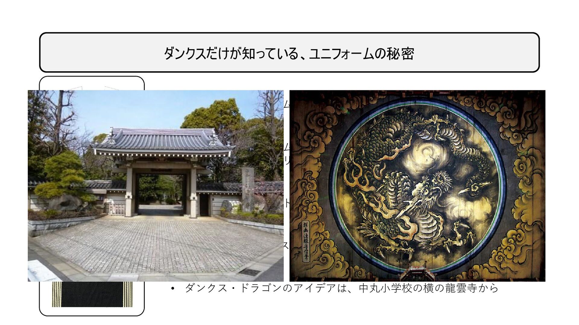 ダンクスだけが知っている、ユニフォームの秘密 • ダンクス・ドラゴンのアイデアは、中丸小学校の横の龍雲寺から • どちらのユニフォームも、使っている色は同じ(黒、白、ゴールド) • 黒は前のユニフォームから歴史をリスペクト。白はフェアプレー、ゴー ルドは勝利(ビクトリー) • ユニフォームのサイドラインは、攻めと守りの一体感を表現