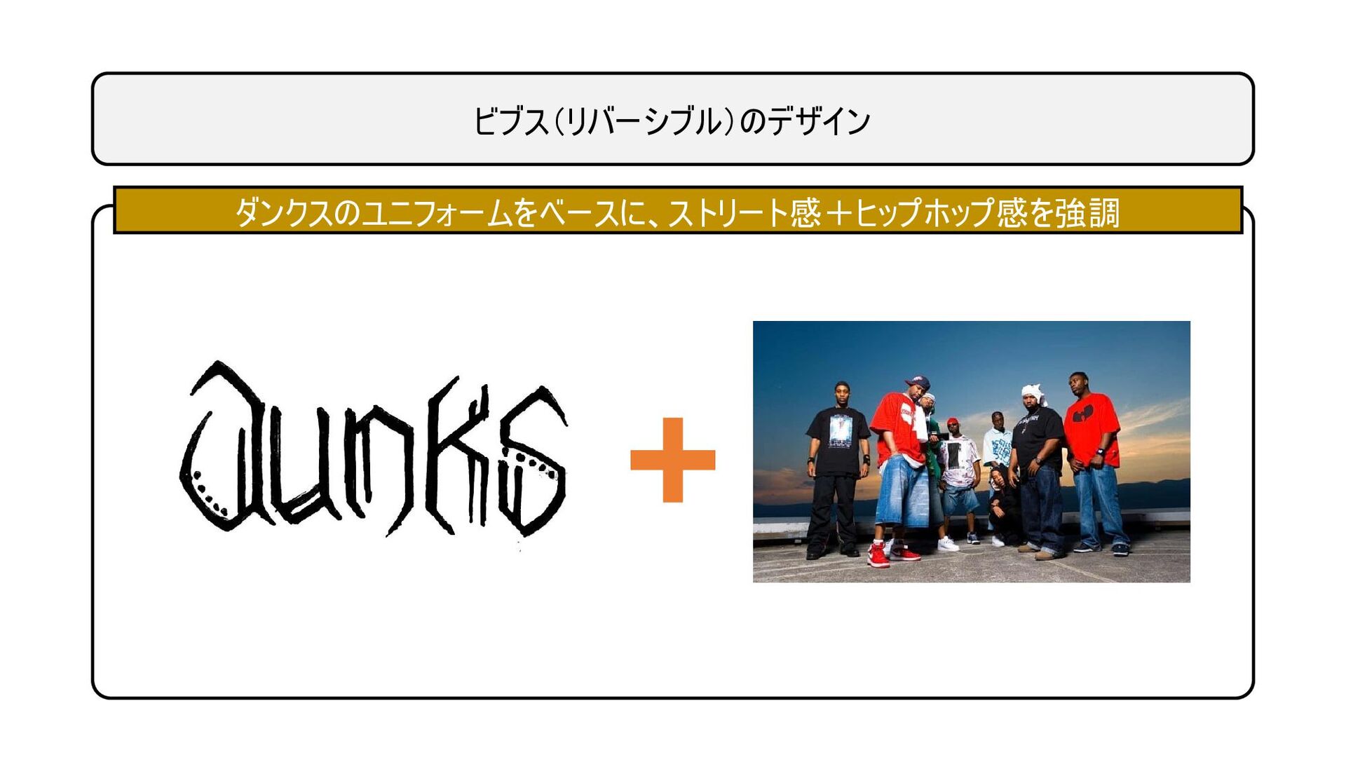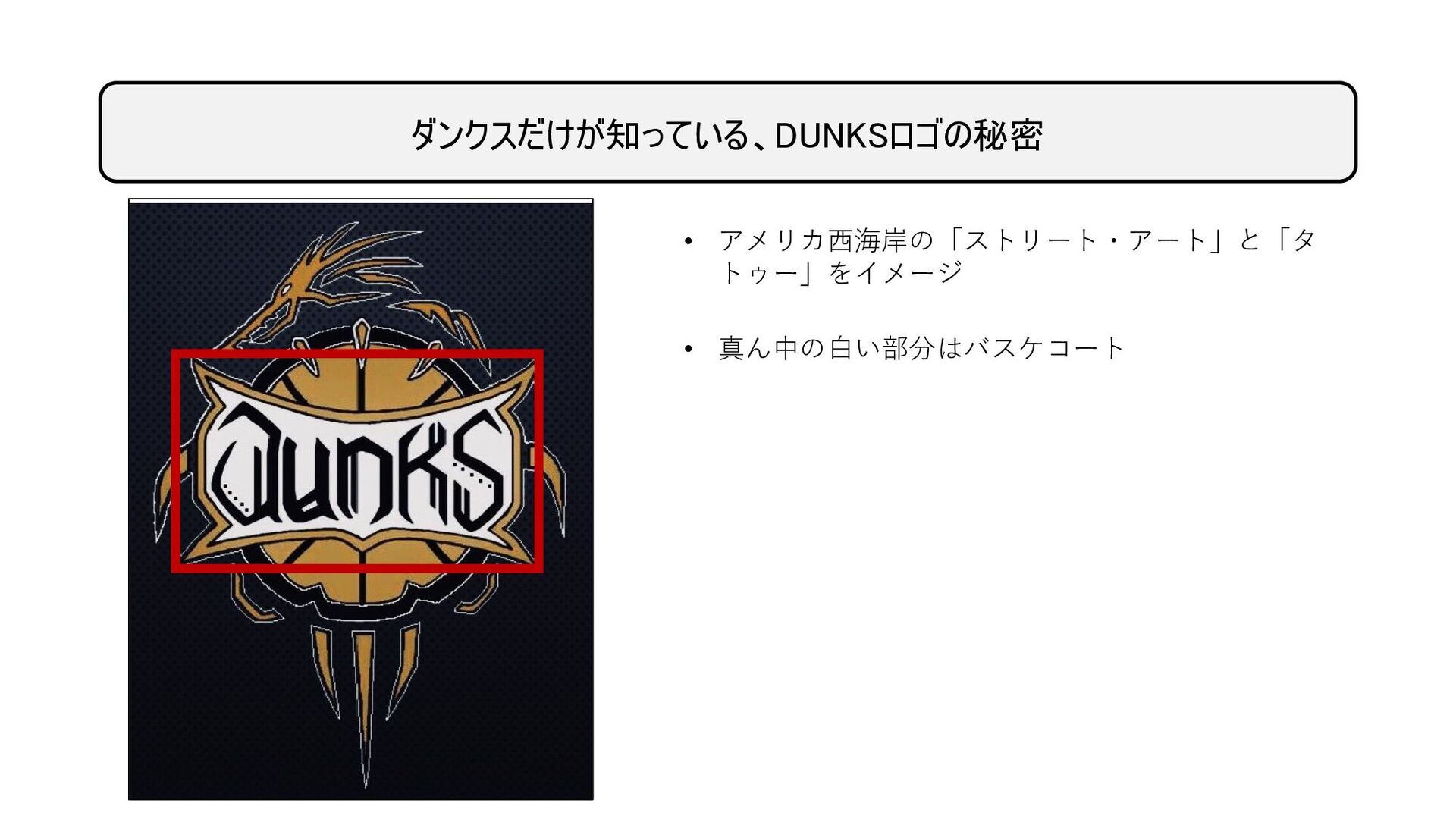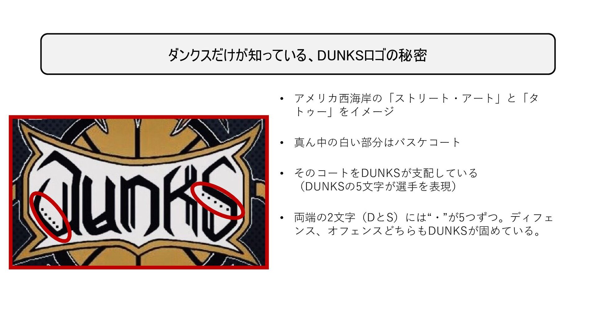 ダンクスだけが知っている、DUNKSロゴの秘密 • アメリカ西海岸の「ストリート・アート」と「タ トゥー」をイメージ • 真ん中の白い部分はバスケコート • そのコートをDUNKSが支配している (DUNKSの5文字が選手を表現)