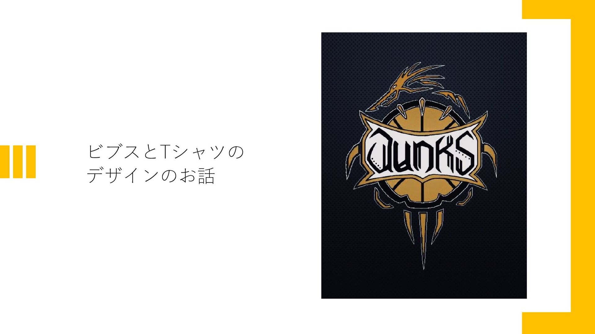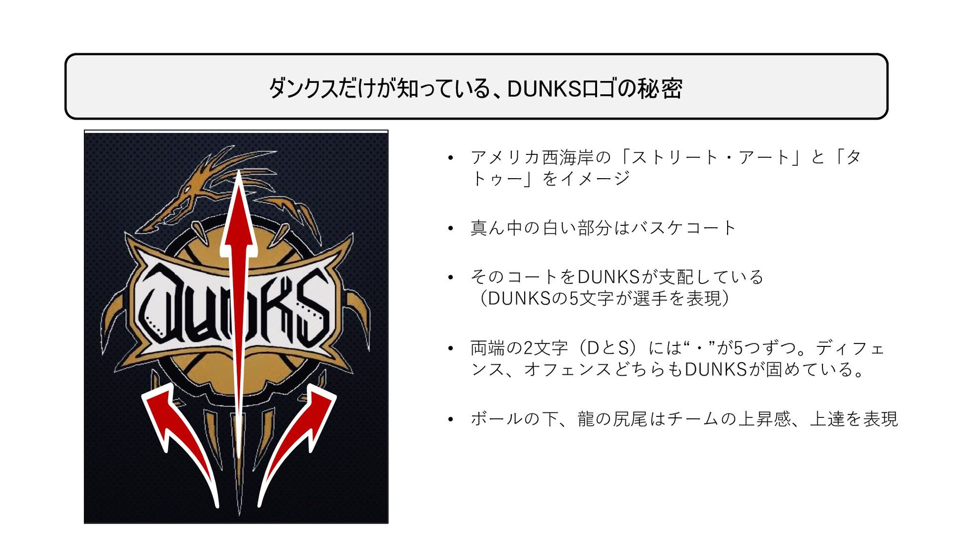 両端の2文字(DとS)には“・”が5つずつ。ディフェ ンス、オフェンスどちらもDUNKSが固めている。 • ボールの下、龍の尻尾はチームの上昇感、上達を表現