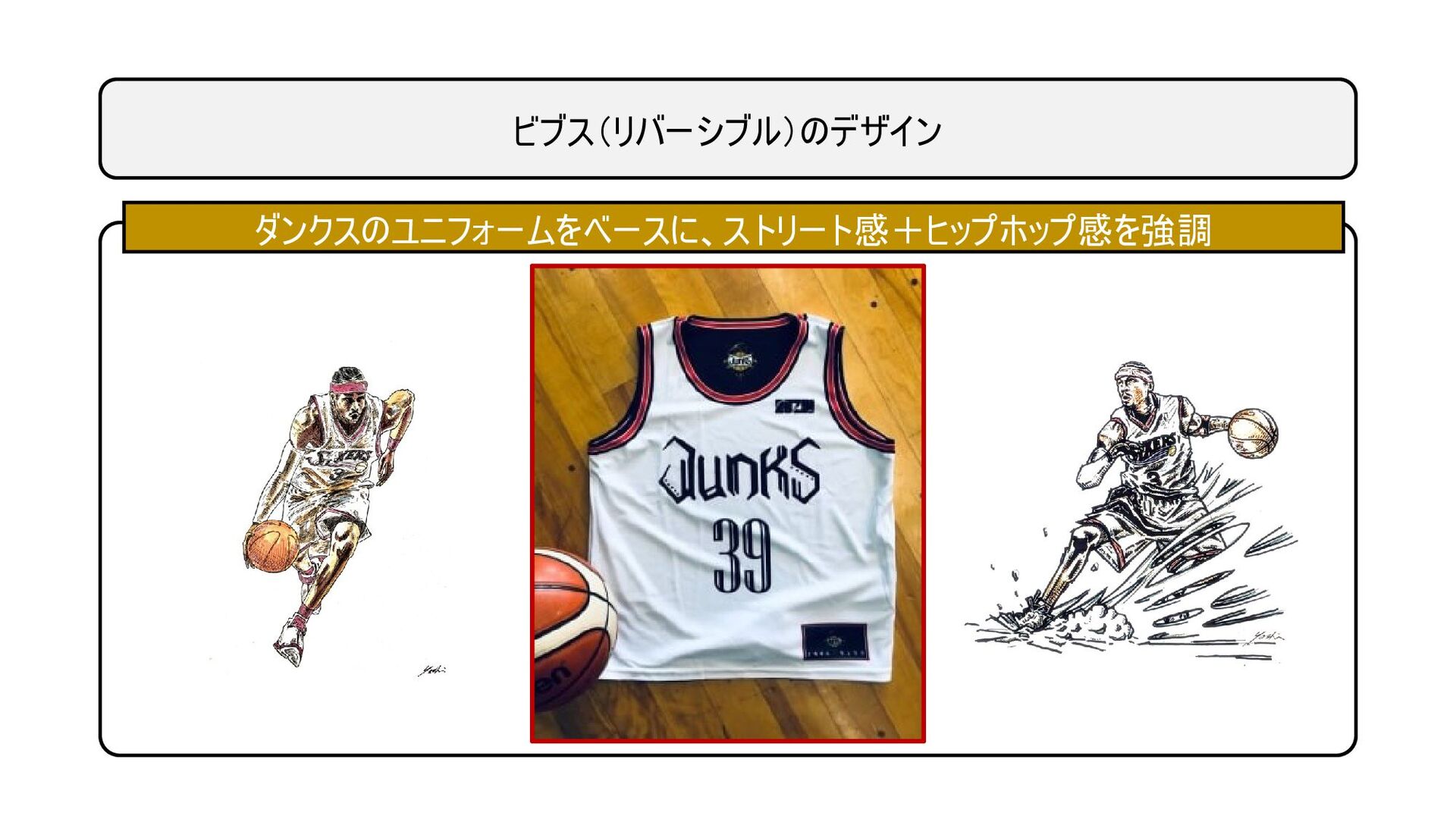 ビブス(リバーシブル)のデザイン ダンクスのユニフォームをベースに、ストリート感+ヒップホップ感を強調