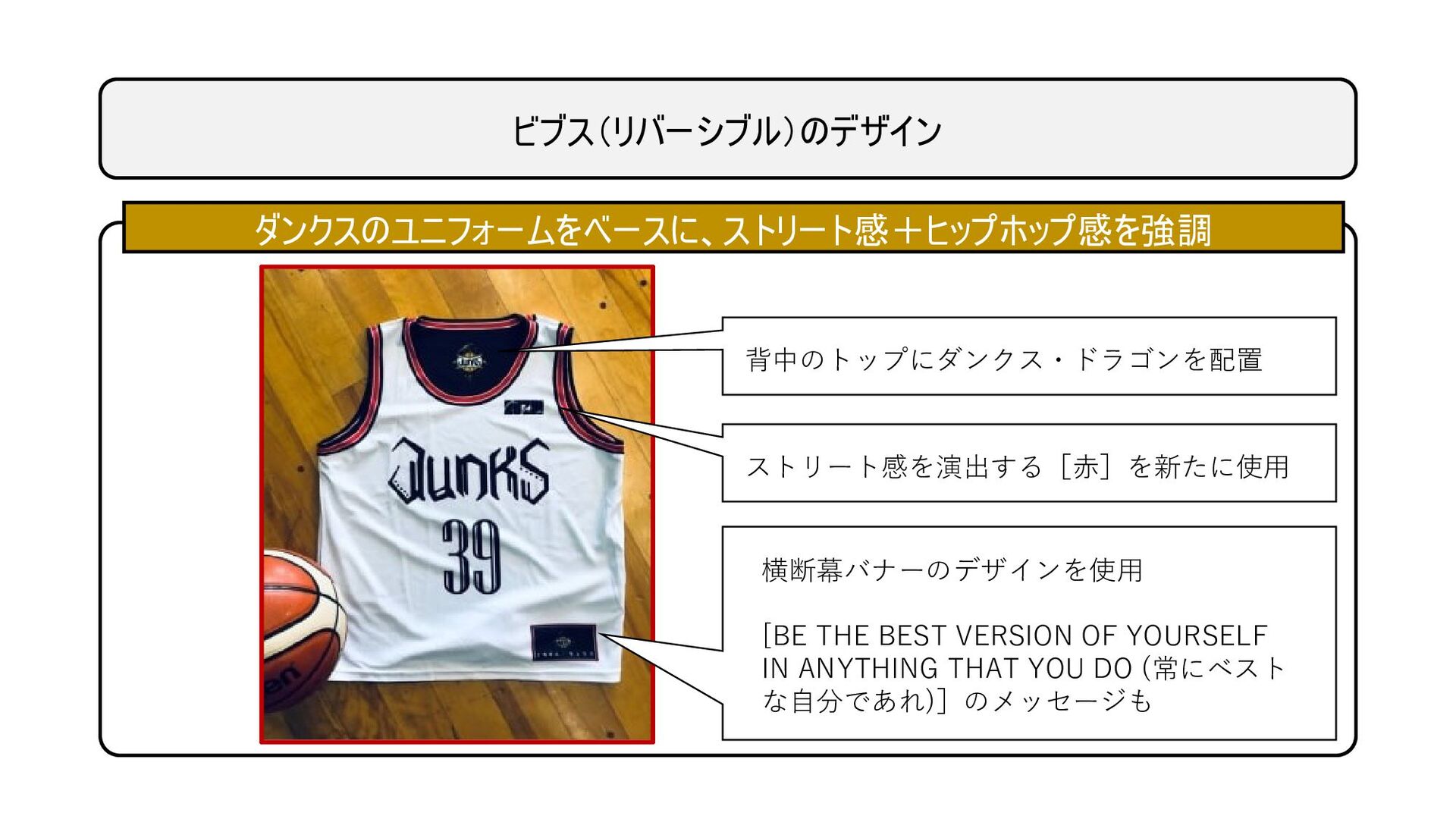 ビブス(リバーシブル)のデザイン ダンクスのユニフォームをベースに、ストリート感+ヒップホップ感を強調 背中のトップにダンクス・ドラゴンを配置 横断幕バナーのデザインを使用 [BE THE BEST VERSION OF YOURSELF