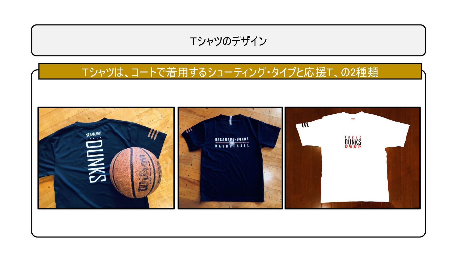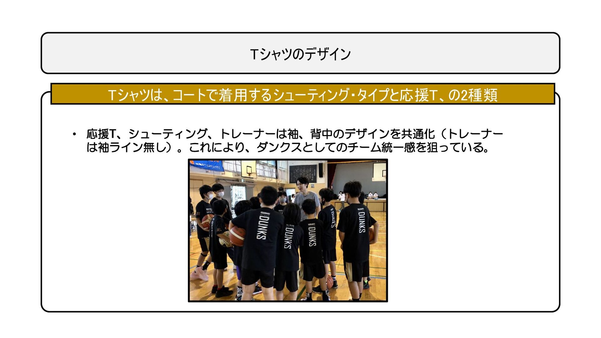Tシャツのデザイン Tシャツは、コートで着用するシューティング・タイプと応援T、の2種類 • 応援T、シューティング、トレーナーは袖、背中のデザインを共通化(トレーナー は袖ライン無し)。これにより、ダンクスとしてのチーム統一感を狙っている。