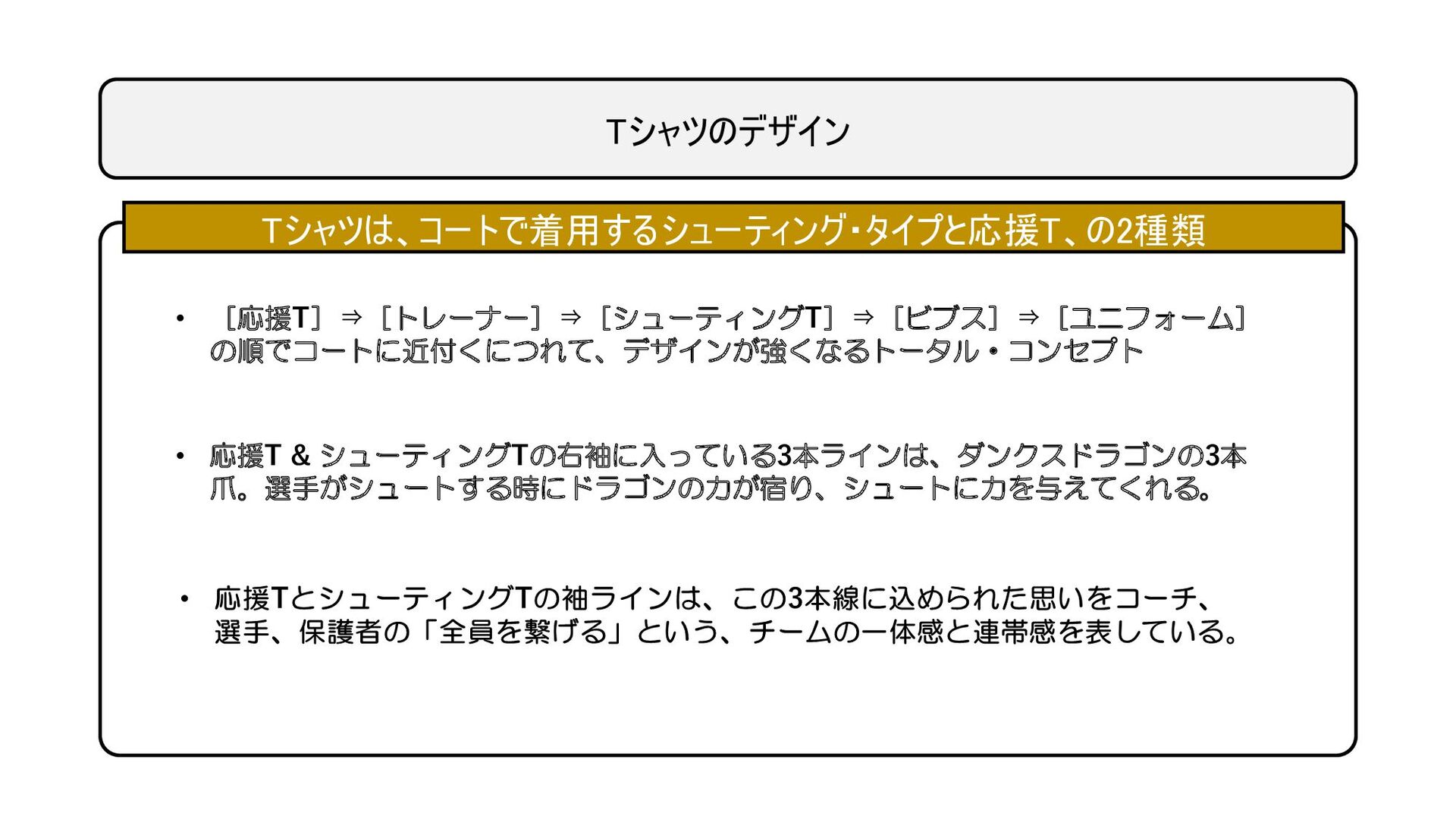 Tシャツのデザイン Tシャツは、コートで着用するシューティング・タイプと応援T、の2種類 • [応援T]⇒[トレーナー]⇒[シューティングT]⇒[ビブス]⇒[ユニフォーム] の順でコートに近付くにつれて、デザインが強くなるトータル・コンセプト • 応援T & シューティングTの右袖に入っている3本ラインは、ダンクスドラゴンの3本 爪。選手がシュートする時にドラゴンの力が宿り、シュートに力を与えてくれる。